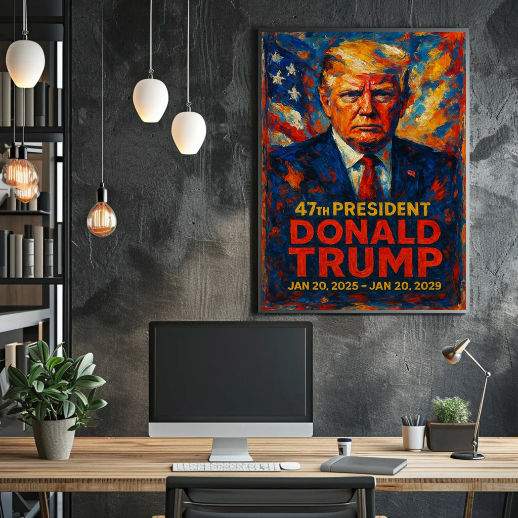 Immerse yourself in this dynamic representation of President Donald Trump, masterfully captured in a whirlwind of vivid color. Set against a backdrop that evokes the essence of the American flag, this poster radiates intensity and hope. Trump's assertive gaze and purposeful demeanor embody resilience and visionary leadership, while bold, expressive impressionism-inspired strokes in red, blue, and orange celebrate patriotism and national spirit.