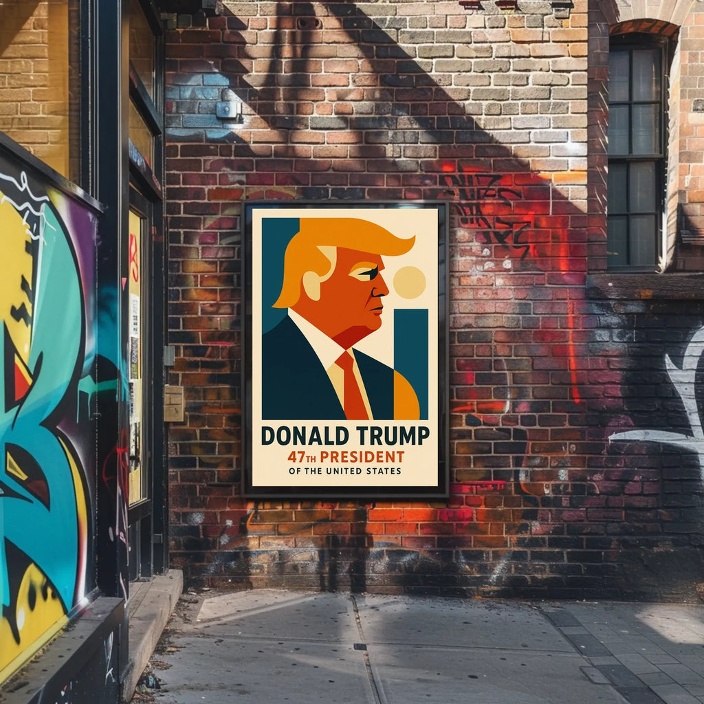 Donald Trump Visionary in Abstract Poster captures President Donald Trump in a sleek, abstract presentation. His profile is sharply defined by angular lines and rich textures, exuding a forward-looking vision. The blend of warm hues, interspersed with geometric patterns, conjures vibrant energy that emphasizes his role as a transformative figure. Set against a minimalist backdrop, this poster embodies a modern artistic expression and crafts a narrative of innovation and progress.