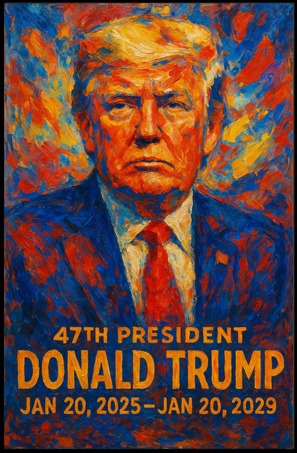 Donald Trump Visionary in Red and Blue Poster celebrates the beauty of this captivating artwork. A masterful impressionistic portrayal captures the essence of Donald Trump as a visionary leader. The bold reds and deep blues burst with energy, reflecting the passionate spirit and steadfast determination of the 47th President. Trump’s resolute expression stands against a dynamic, colorful backdrop symbolizing an era of new possibilities and dynamic leadership. Each brushstroke conveys intensity and historical gravity, invoking awe and patriotic pride. This poster is a compelling addition for any art enthusiast or history buff.