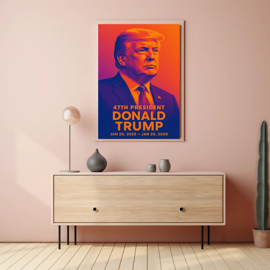 In this striking artwork, Donald Trump is portrayed with an air of determination and vision, set against a minimalist backdrop that amplifies his presence. The bold use of intense orange and vivid purple creates a sense of energetic contrast, embodying Trump’s dynamic approach to leadership. His resolute gaze is fixed towards what lies ahead, symbolizing his forward-thinking stance as he led the nation into a new chapter from 2025 to 2029. This collectible piece is a tribute to his impactful tenure and a must-have for those who appreciate bold artistic expressions of American leadership.
