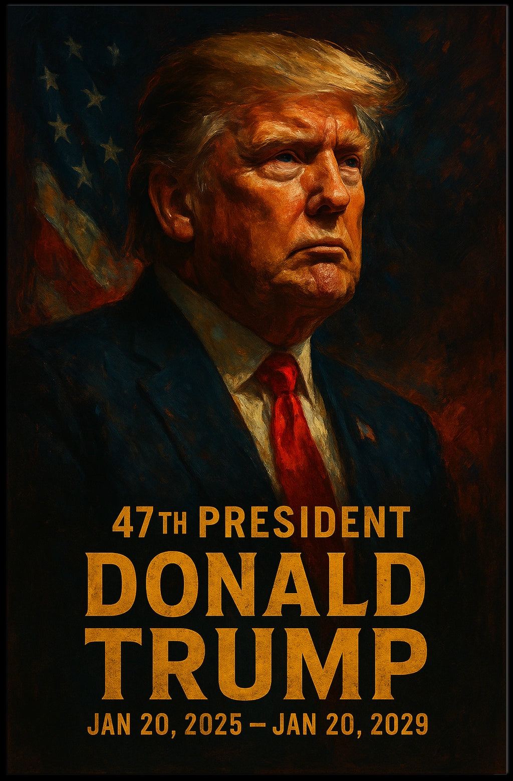This poster captures President Donald Trump in a visionary light, utilizing the classic richness of oil painting to bring out both the strength and foresight in his eyes. The lighting cascades dramatically across the canvas, emphasizing Trump's commanding presence and impactful tenure as the 47th President. The background subtly showcases abstracted elements of the American flag, symbolizing the unity and aspirational spirit of a nation under his leadership. The bold typography commemorates his term from January 20, 2025, to January 20, 2029, creating a timeless piece of artwork that evokes reflection and patriotism.
