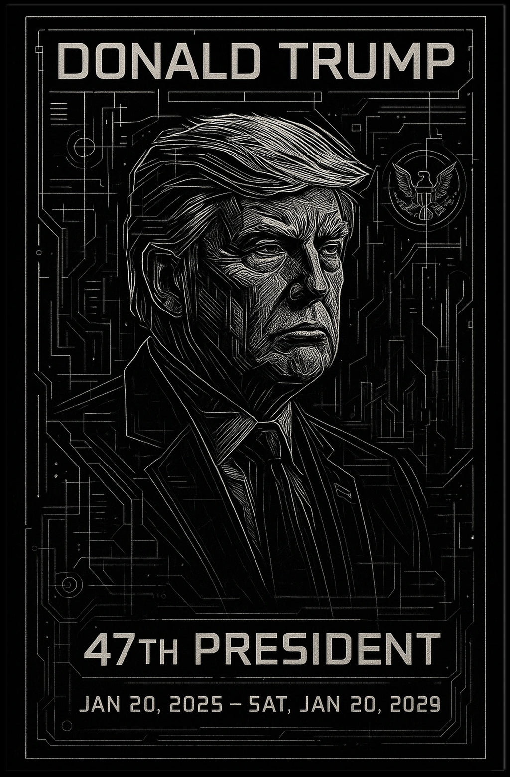 This captivating poster captures Donald Trump set against an intricate web of digital patterns, embodying a future-focused vision that merges strength with innovation. The sharp, bold lines give him an authoritative presence, while the serene monochromatic tones add a reflective depth. It’s an artwork that transcends time, echoing both the traditions and the emerging modernity of his leadership style. The digital, circuit-like background symbolizes a seamless blend of technology and governance, portraying Trump as a leader ready to embrace the challenges of the modern era with steadfast determination and foresight.
