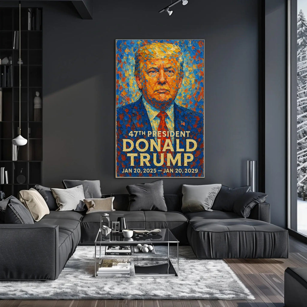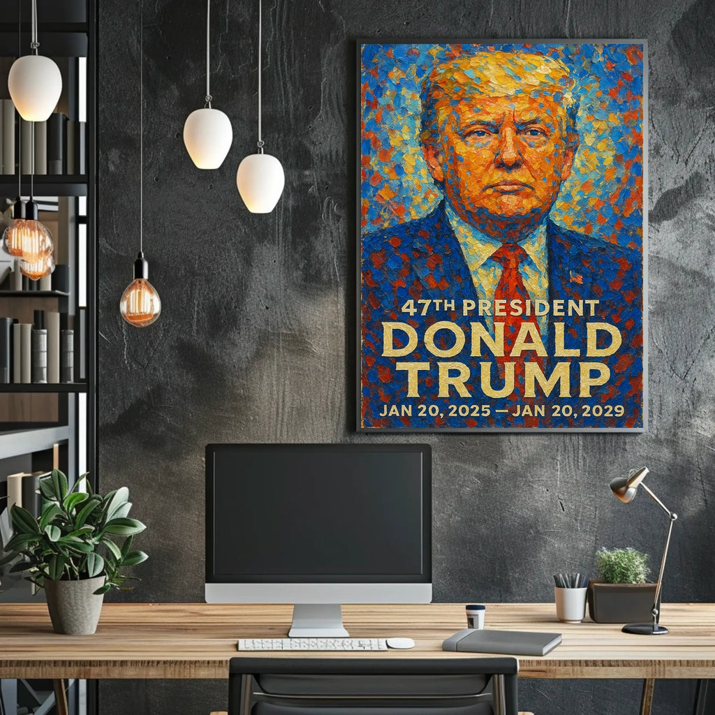 This striking artwork captures President Donald Trump in an impressionistic style, exuding a potent mix of authority and charisma. Swirling blues and oranges create an energetic background that symbolizes the dynamic nature of his leadership. The bold colors reflect his assertiveness and forward-thinking nature. Trump's confident gaze is unwavering, embodying the spirit of resilience and vision that defined his presidency. The harmonious blend of colors in his attire echoes the strength and unity he aimed to instill. This piece is a powerful testament to a bold and controversial era of American leadership.