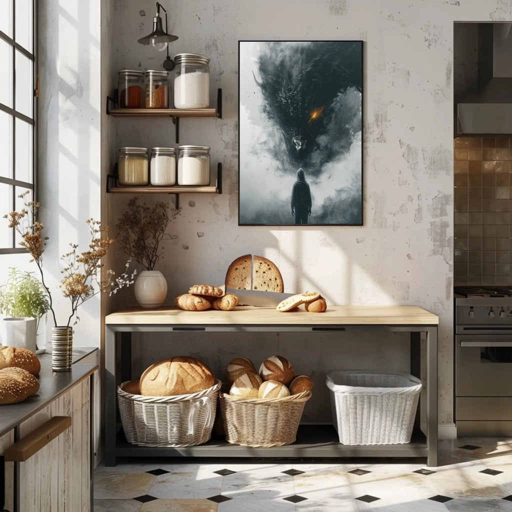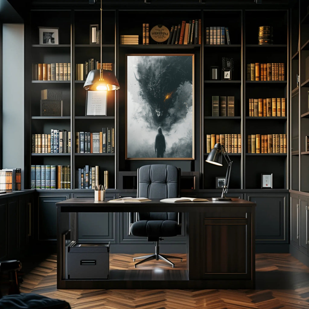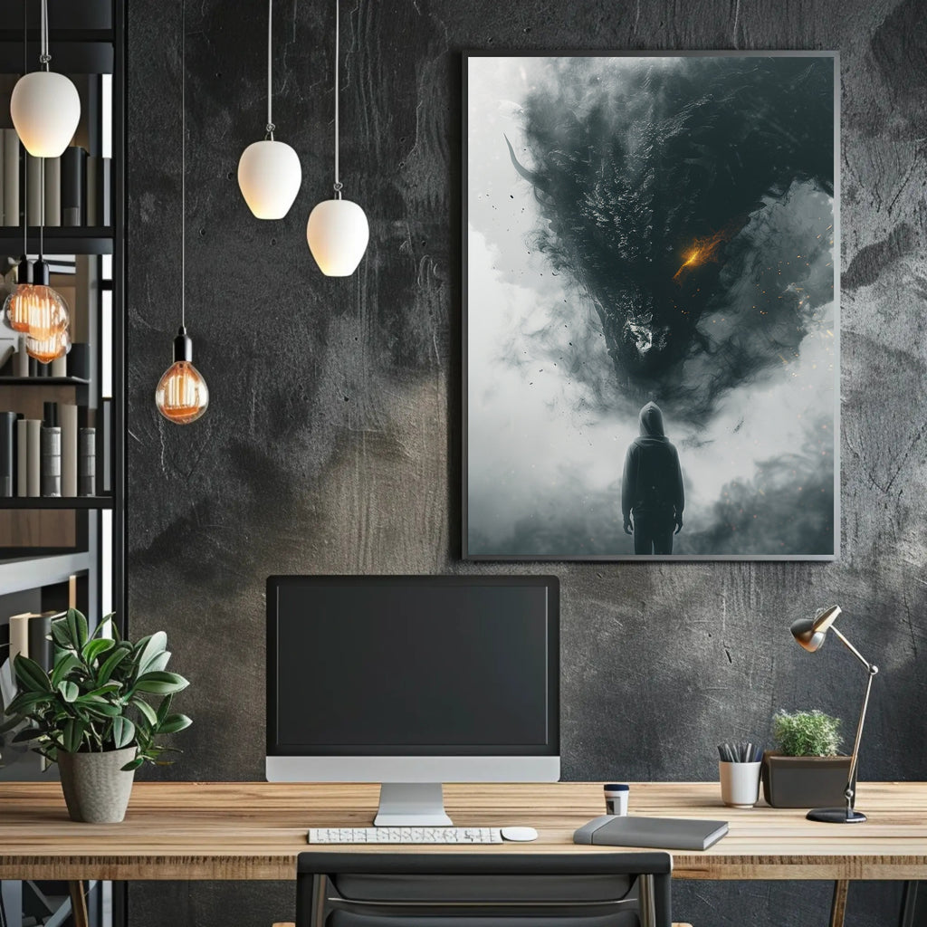 Dragon Confrontation: Dark Fantasy Art Poster from PosterGoat captures a breathtaking moment of tension — a solitary hooded figure standing beneath a colossal, smoke-formed dragon whose single, fiery eye pierces a storm of clouds. This photorealistic, surreal composition blends dramatic contrast, fine texture, and cinematic scale to create an immersive dark fantasy piece that commands attention on any wall.