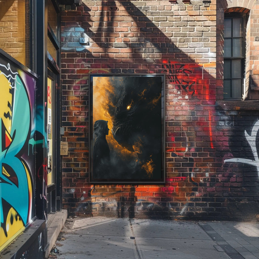 Dragon Confrontation Fantasy Art Poster Print by PosterGoat brings an epic, photorealistic moment of mythical tension into your home — a hooded figure standing fearlessly face-to-face with a colossal dragon, illuminated by swirling fiery smoke and a single, molten eye. This dramatic Poster blends photorealism and fantasy to create an immersive centerpiece for any wall.