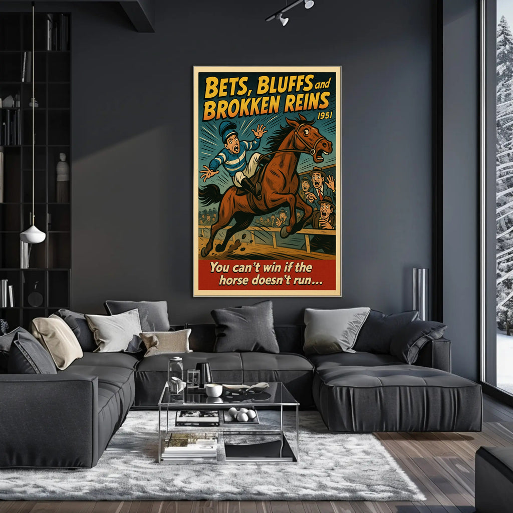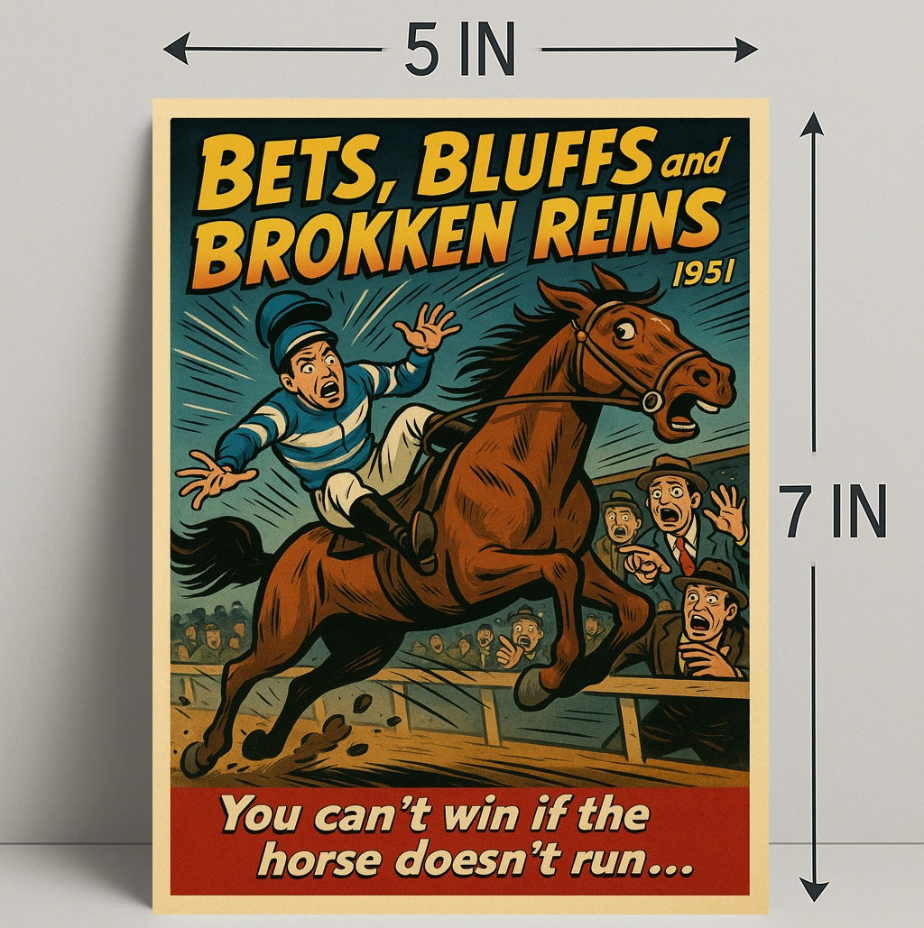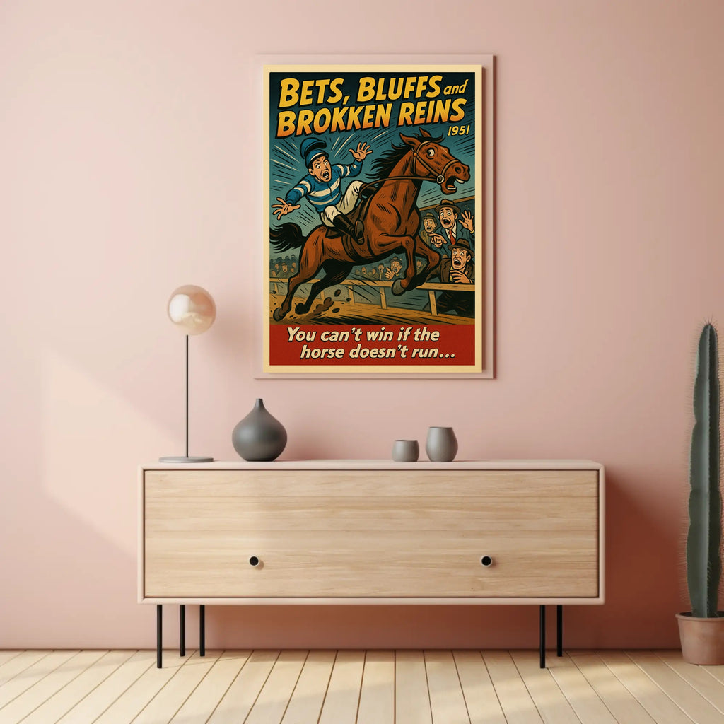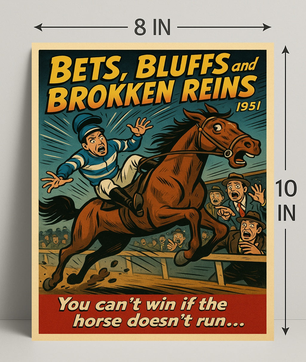 Experience the thrill and nostalgia of the mid-20th century with the "Bets, Bluffs and Brokken Reins" vintage poster from PosterGoat. This captivating piece, set in 1951, encapsulates the excitement of horse racing, showcasing a tense moment as a jockey in a striking blue and white striped uniform battles to control a rearing horse, while astonished spectators in period attire look on. Perfect for any sports enthusiast or vintage art lover, this poster adds a dynamic touch to your decor.