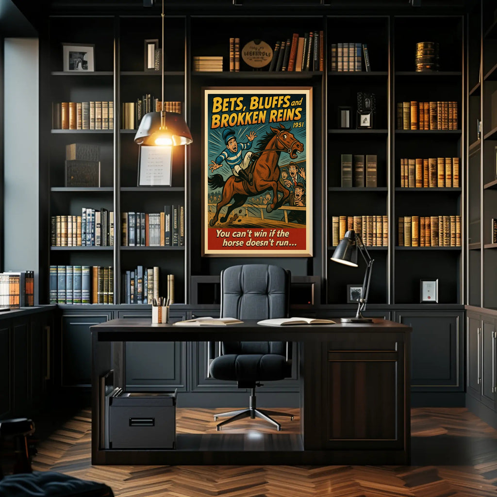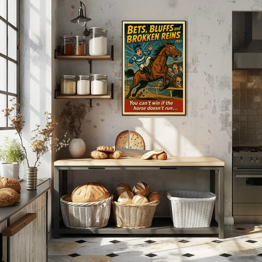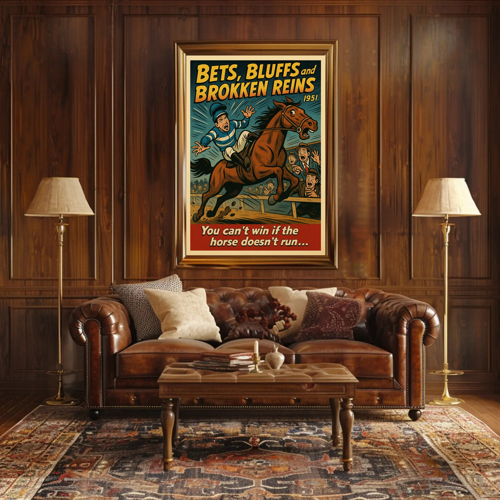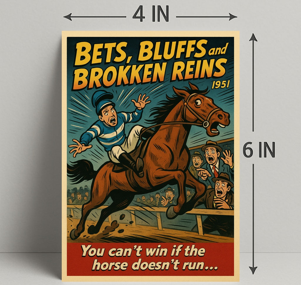 Experience the thrill and nostalgia of the mid-20th century with the "Bets, Bluffs and Brokken Reins" vintage poster from PosterGoat. This captivating piece, set in 1951, encapsulates the excitement of horse racing, showcasing a tense moment as a jockey in a striking blue and white striped uniform battles to control a rearing horse, while astonished spectators in period attire look on. Perfect for any sports enthusiast or vintage art lover, this poster adds a dynamic touch to your decor.