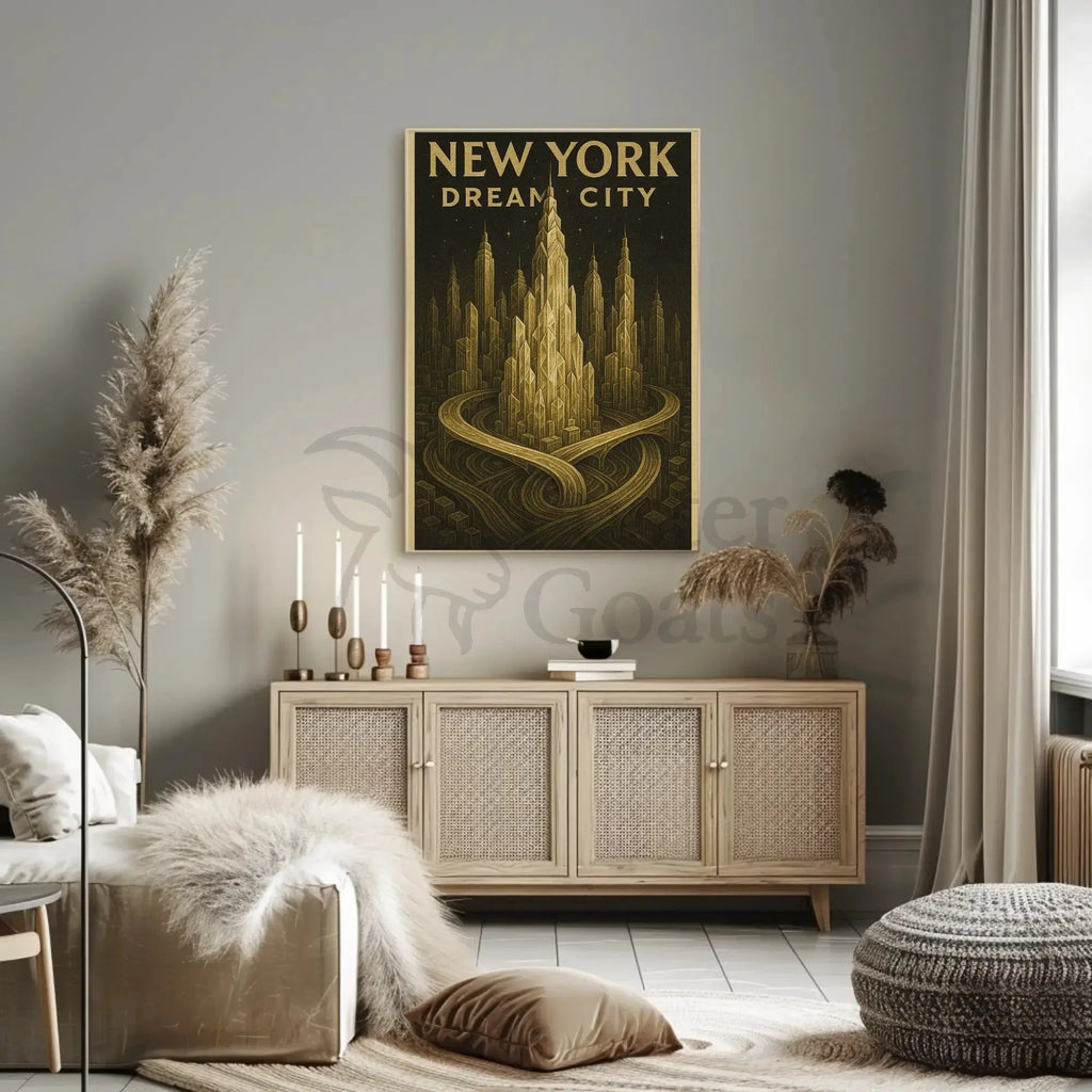 Dream City New York Artistic Travel Poster from PosterGoat transforms any wall into a cinematic tribute to the metropolis — an art deco–inspired cityscape rendered in rich gold tones against deep, dramatic contrast. This poster's stylized skyscrapers, geometric forms and winding elevated pathways evoke early 20th‑century glamour while keeping a modern, visionary edge.