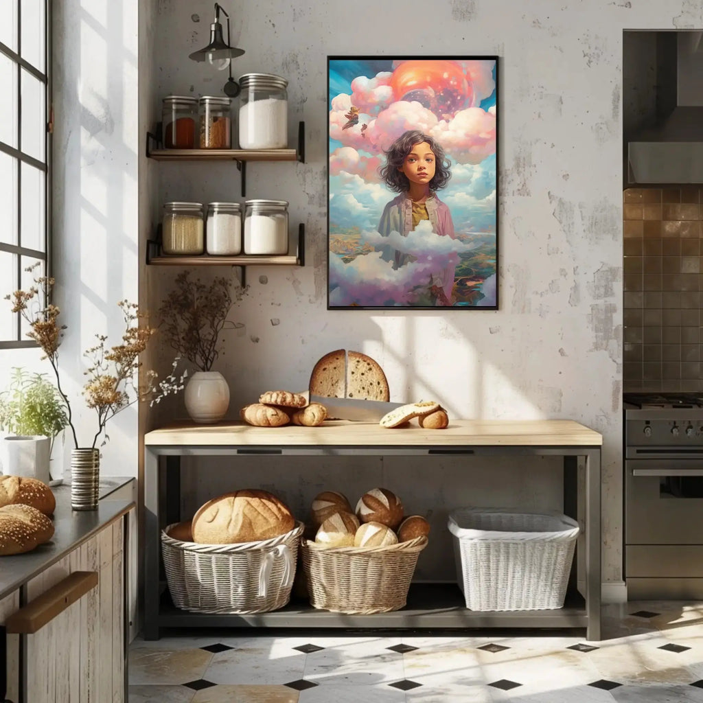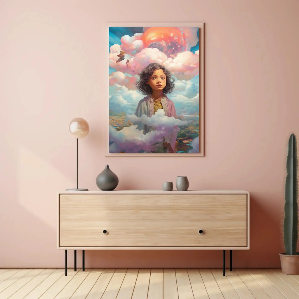 Dreamscape Adventure Fantasy Art Poster by PosterGoat transforms any wall into a gateway to imagination — a richly detailed, surreal poster that blends vibrant pastel clouds, a glowing celestial orb, and a wistful child surrounded by drifting clouds and distant landscapes. Perfect for fans of fantasy art, surrealism, and colorful landscape wall decor.