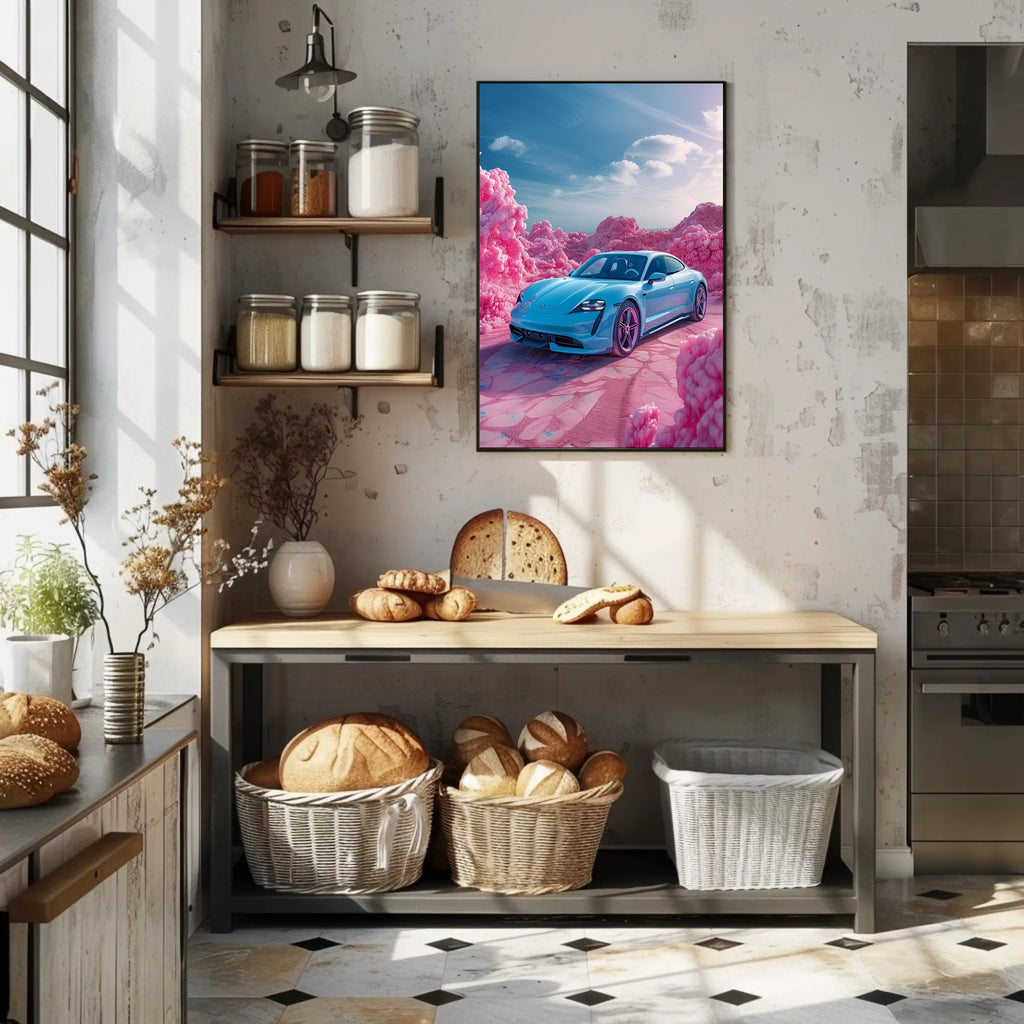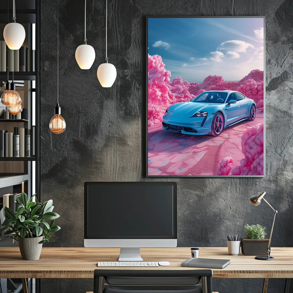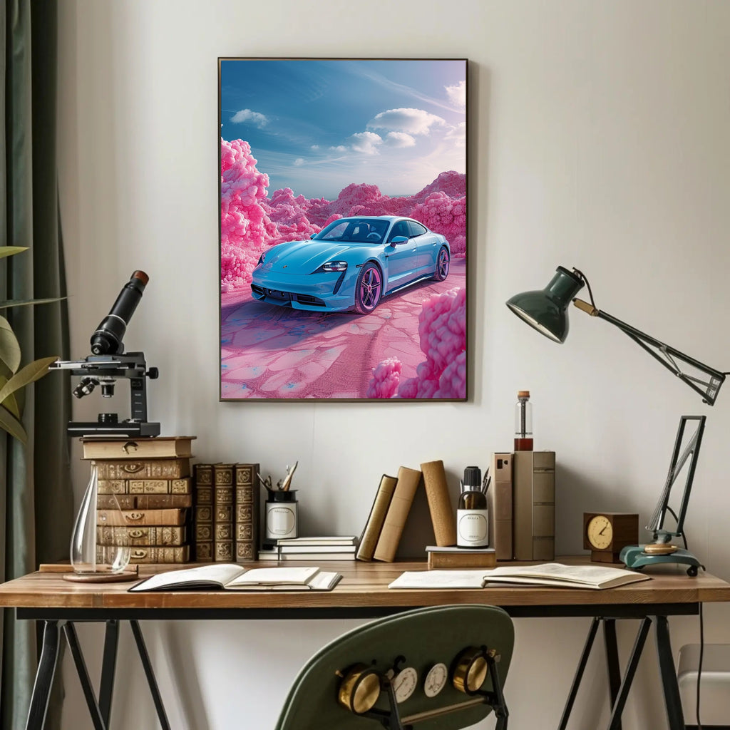 Eye-catching visuals: Vibrant, high-quality print captures fine detail — from the car's reflective curves to the textured, candy-pink landscape — perfect for living rooms, offices, or feature walls.