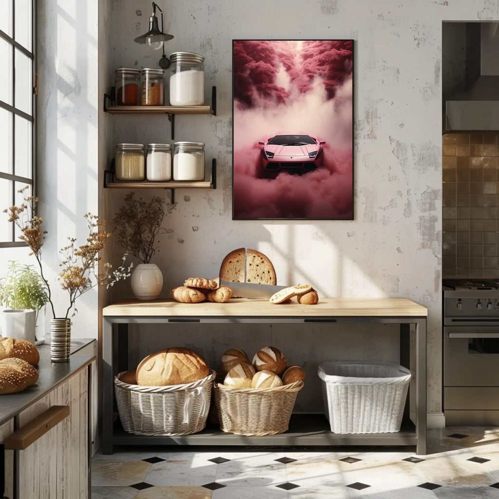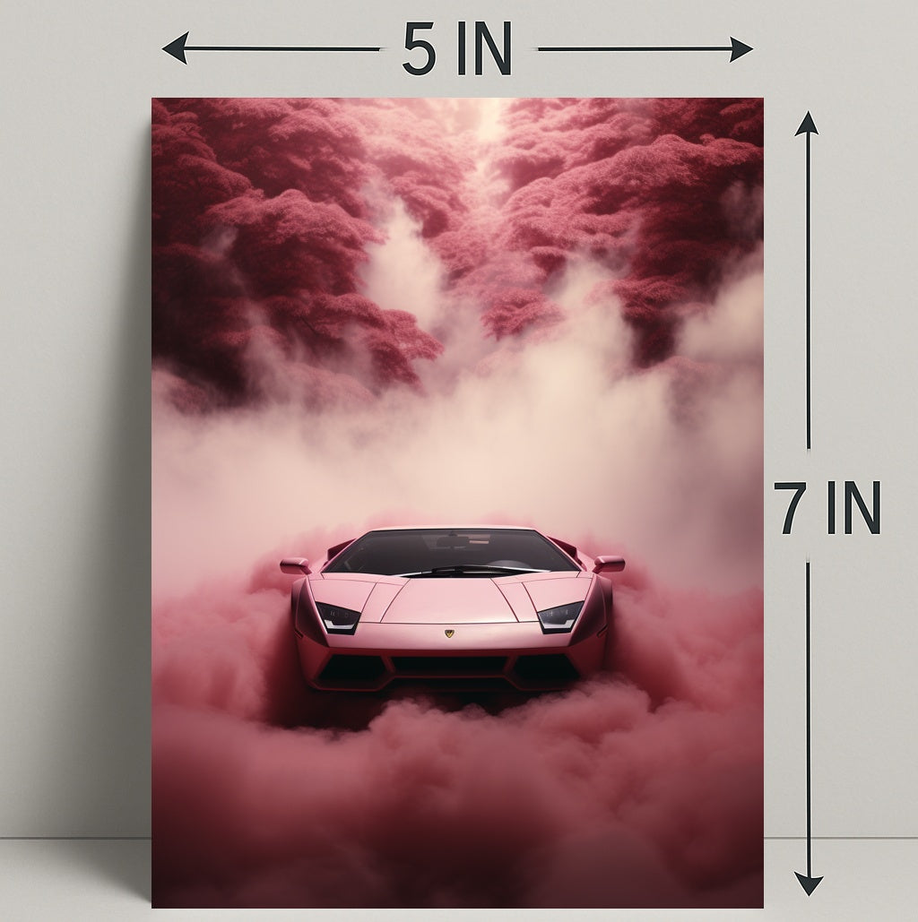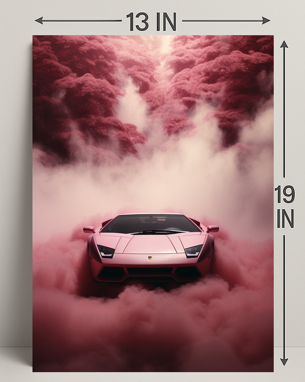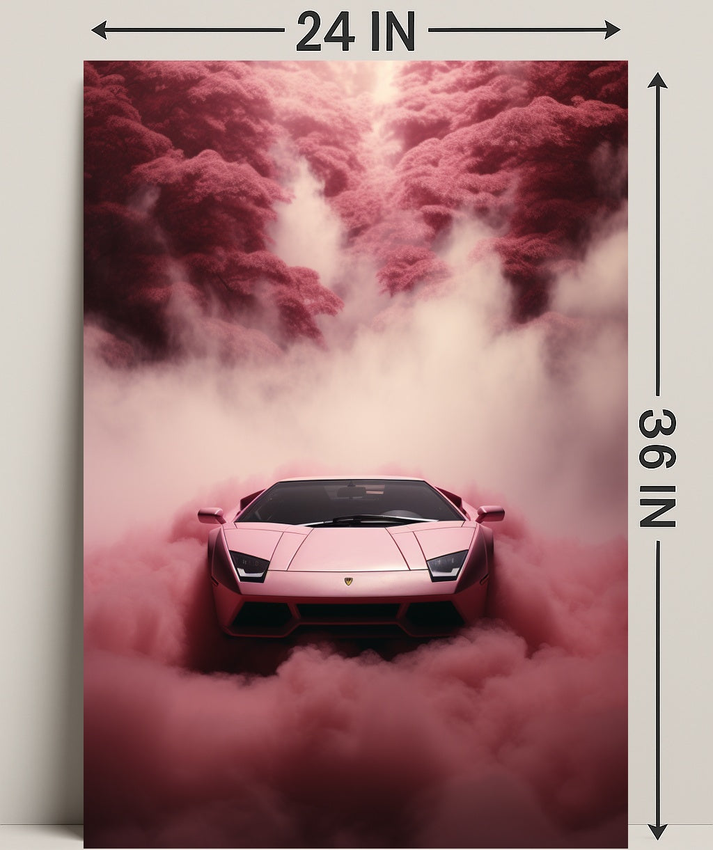 Bring a surreal adventure into your home with the Dreamscape Drive Poster by PosterGoat. This striking wall art features a sleek sports car emerging from billowing pink clouds beneath a canopy of dreamy, rose-hued foliage — a cinematic composition that blends pop-art energy with scenic, travel-inspired imagination.