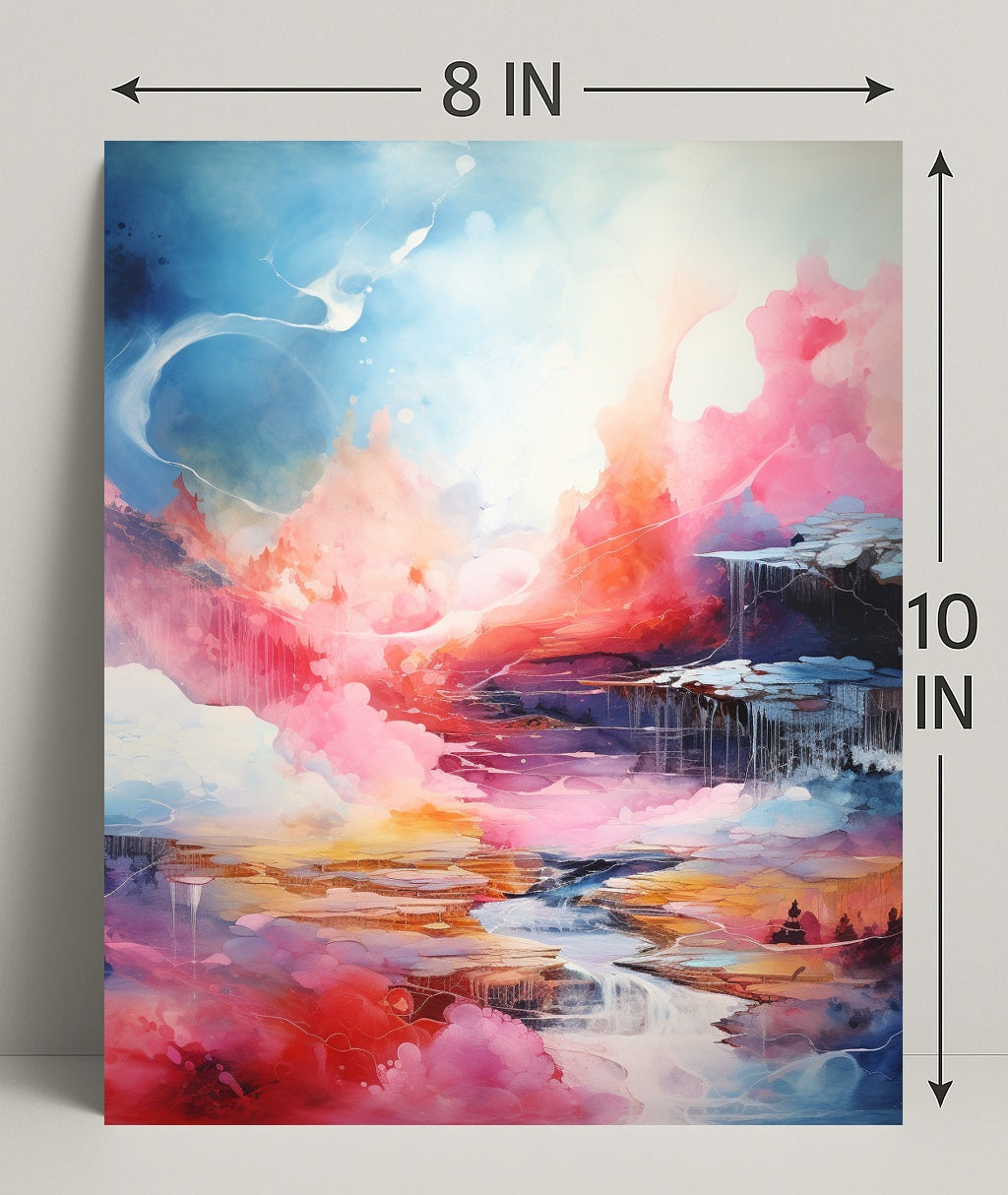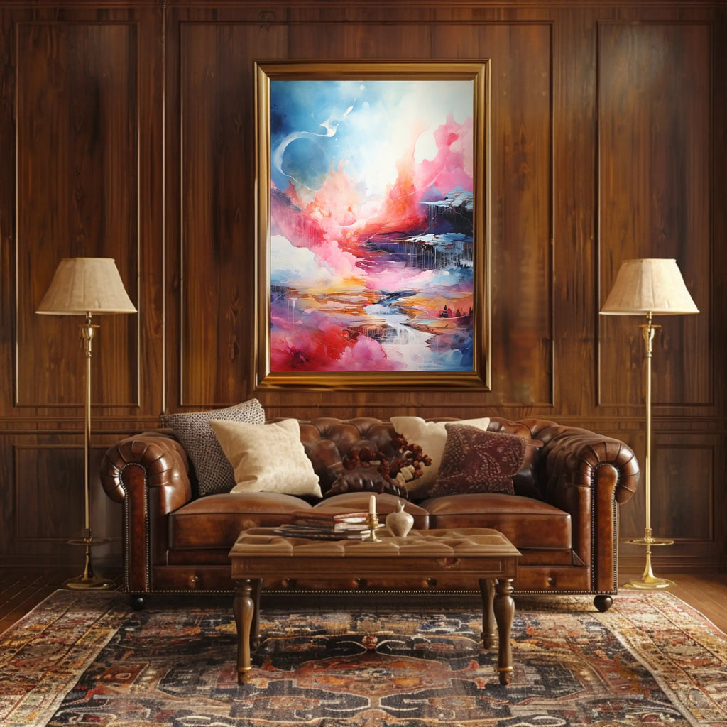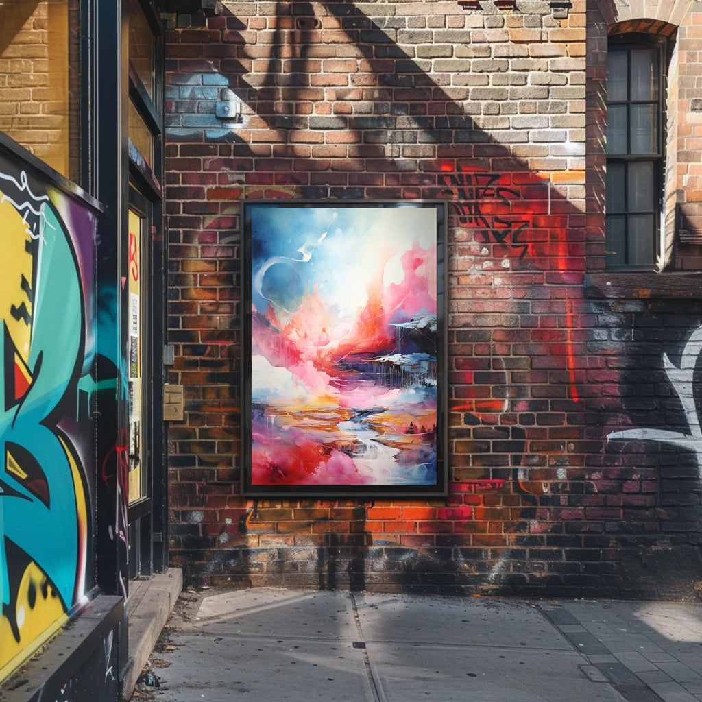 The print showcases vibrant pinks, gentle blues and warm golds that flow together like a symphony of color, with delicate white swirls and layered textures that suggest distant cliffs, waterfalls and floating mist. Mounted in a modern black frame in the lifestyle photos, the piece reads both large and intimate — perfect above a console, sofa or bedroom dresser.