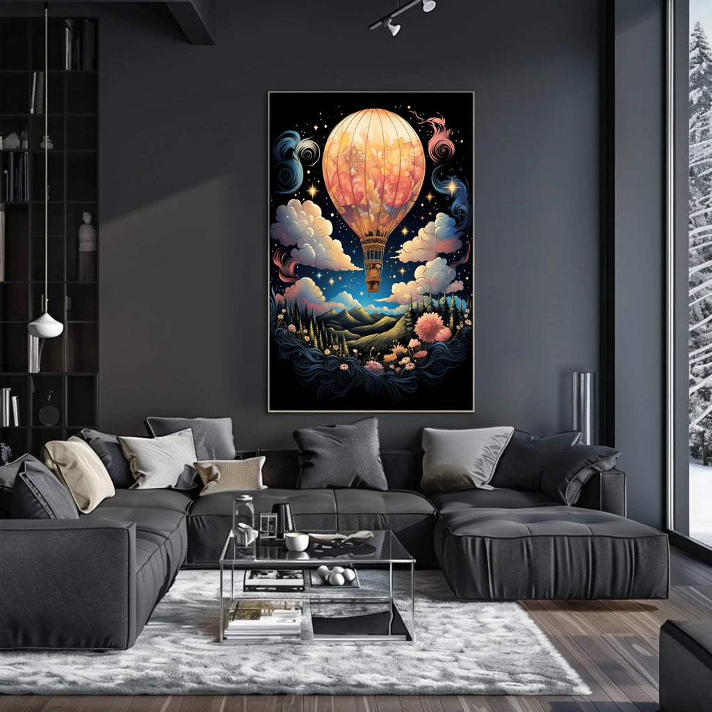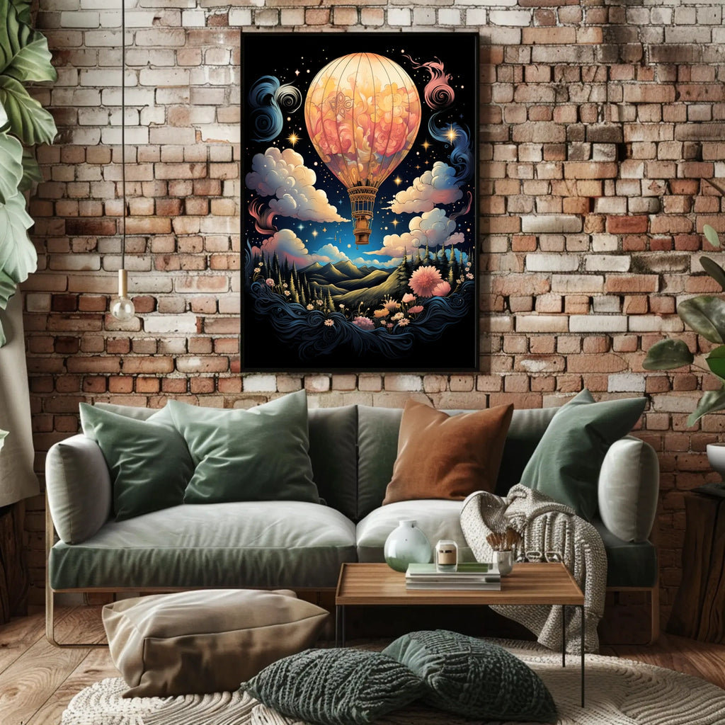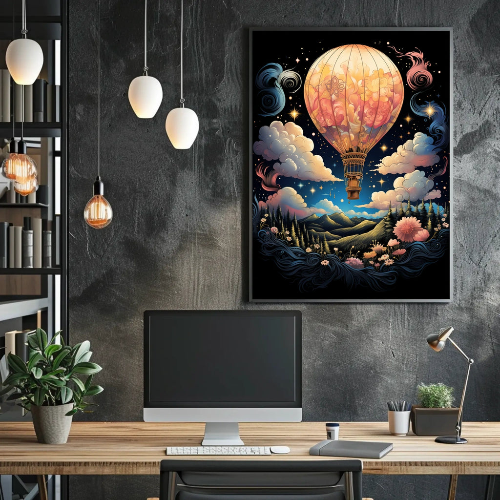 Experience the allure of a whimsical journey with the Dreamscape Voyage poster. This captivating artwork features a hot air balloon gracefully floating through swirling clouds and twinkling stars, set against a magical night sky—perfect for dreamers and adventurers seeking a touch of fantasy in their space.