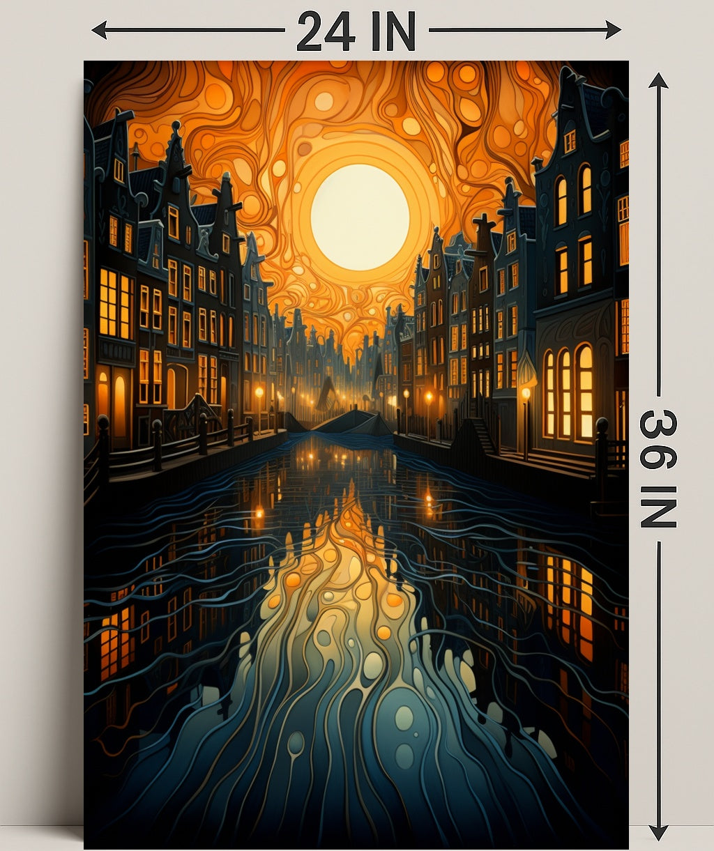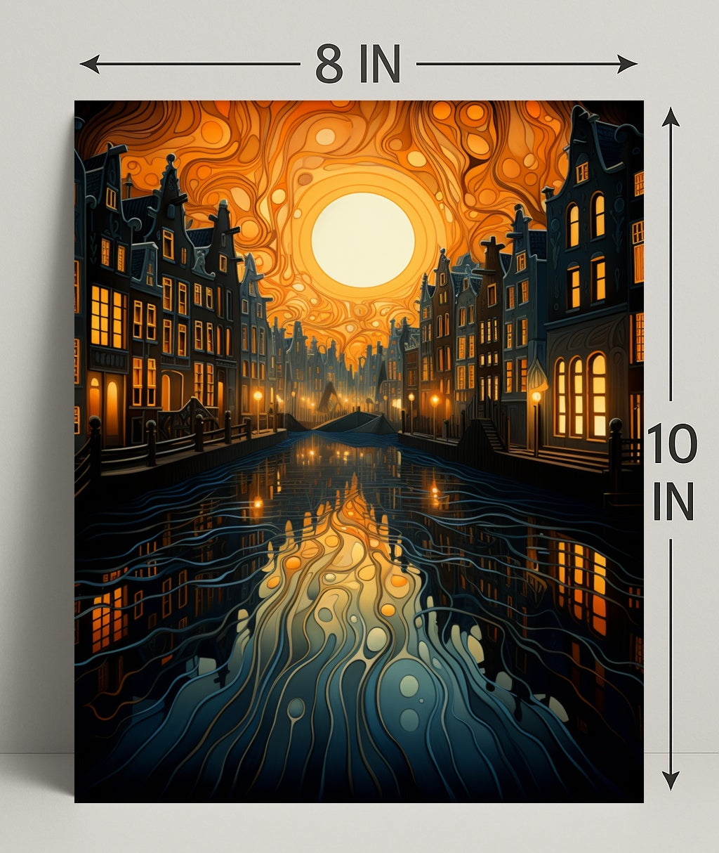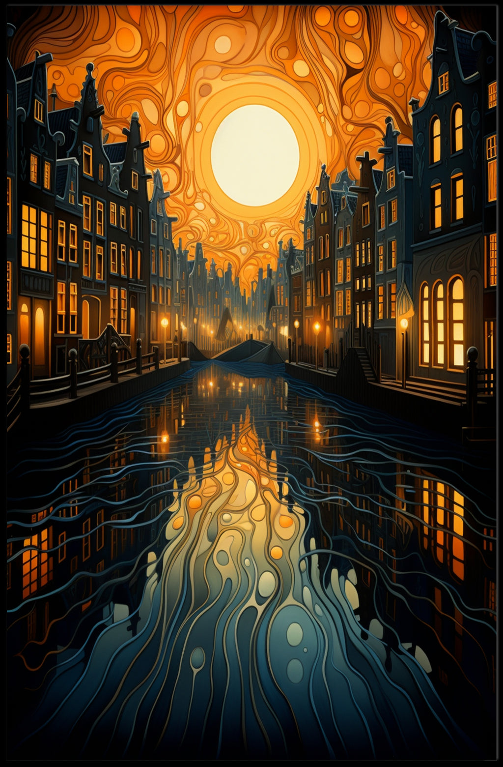 Captivating composition: A bold, circular sun crowns a narrow canal lined with historic gabled buildings, while swirling patterns and rippling water create a hypnotic reflection that draws the eye inward.