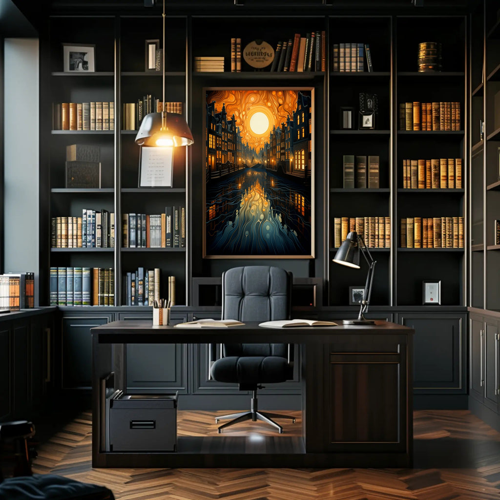 Warm, mood-setting palette: Rich ambers, deep blues and glowing window lights deliver an inviting, cozy atmosphere ideal for living rooms, bedrooms, or office decor.
