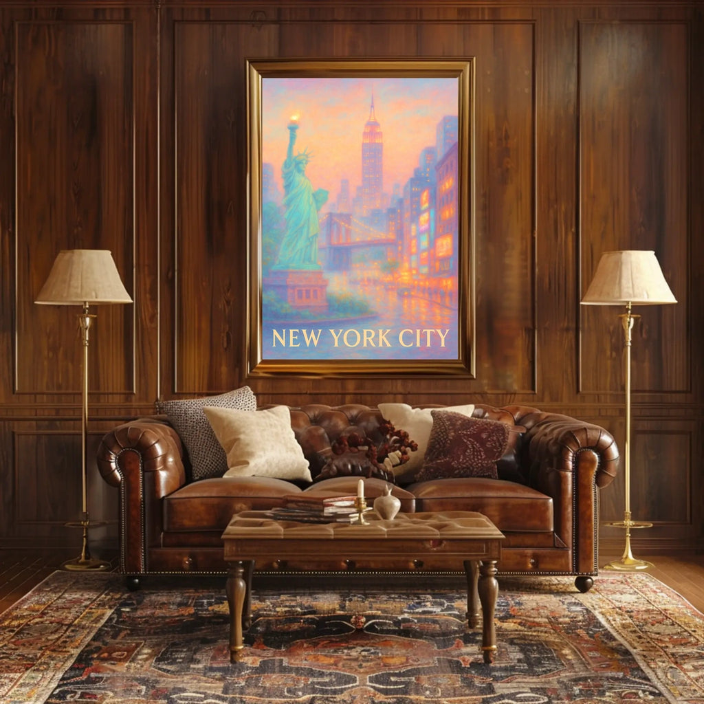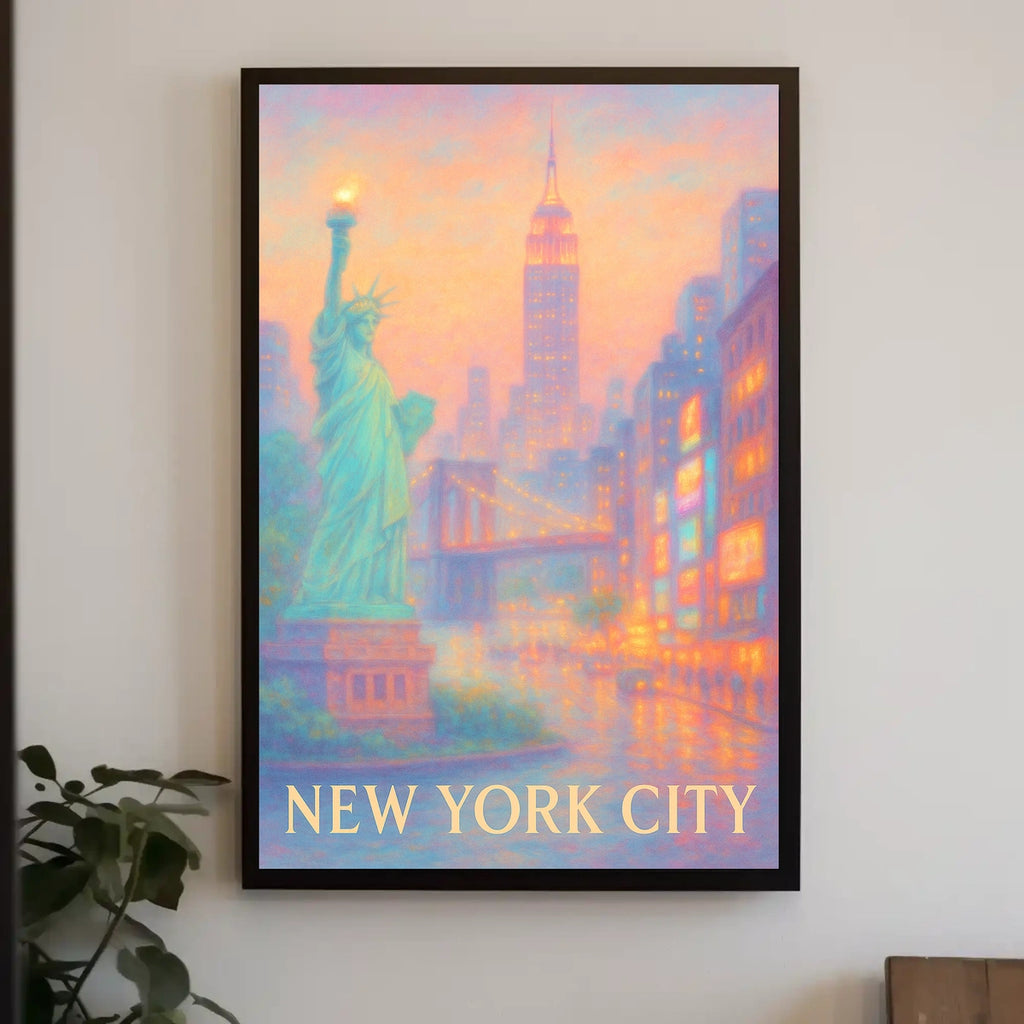 Immerse your space in the magical allure of New York City with this Dreamy New York Cityscape Poster. Featuring a whimsical pastel palette, the artwork blends iconic landmarks with soft, dreamy skies, creating a calming centerpiece for any wall. Perfect for urban lovers and dreamers alike, it invites daily inspiration and cosmopolitan charm.