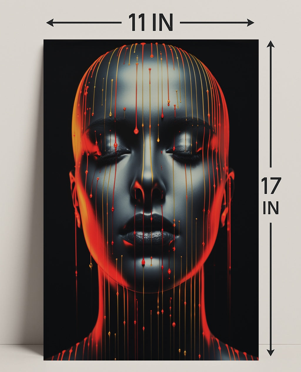 Immerse your space in bold modern art with the Dripping Colors: A Futuristic Portrait Poster from PosterGoat. This striking poster features a sculpted, metallic portrait framed by vibrant, neon-like drips of red and gold that cascade over closed eyes and glossy lips — a mesmerizing blend of pop art energy and futuristic aesthetic.
