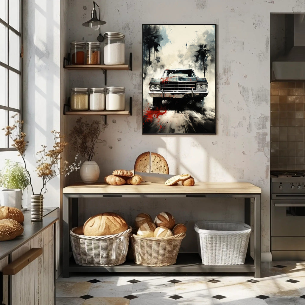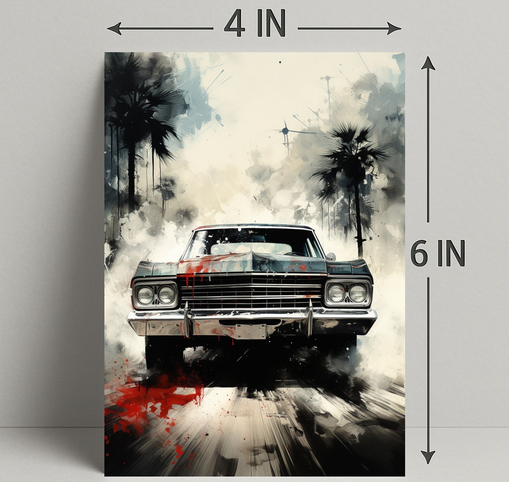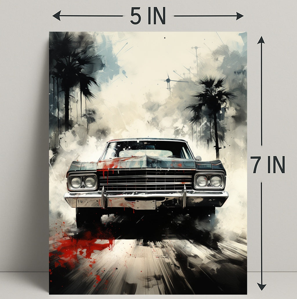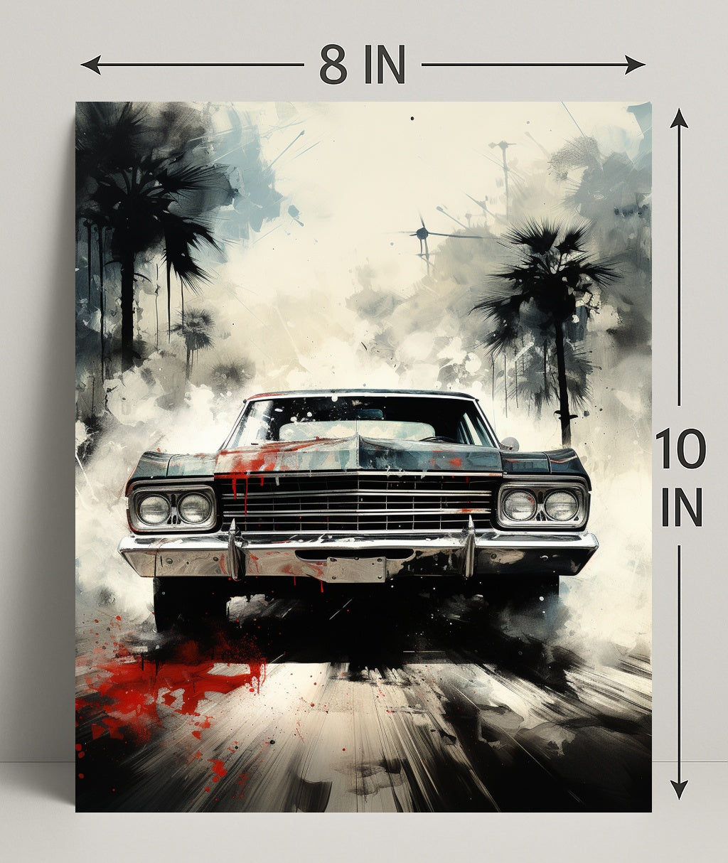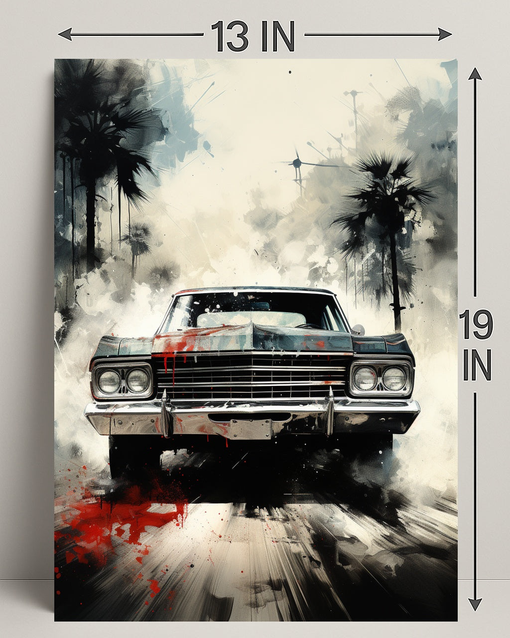 Why it stands out: The composition centers on a bold frontal view of a classic car with chrome detailing, dynamic paint splatters and streaked motion effects that convey speed and intensity. Dark palm silhouettes and textured cloud-like brushwork in the background create an evocative, travel-ready atmosphere ideal for fans of automotive art, scenic souvenirs, and edgy wall art.