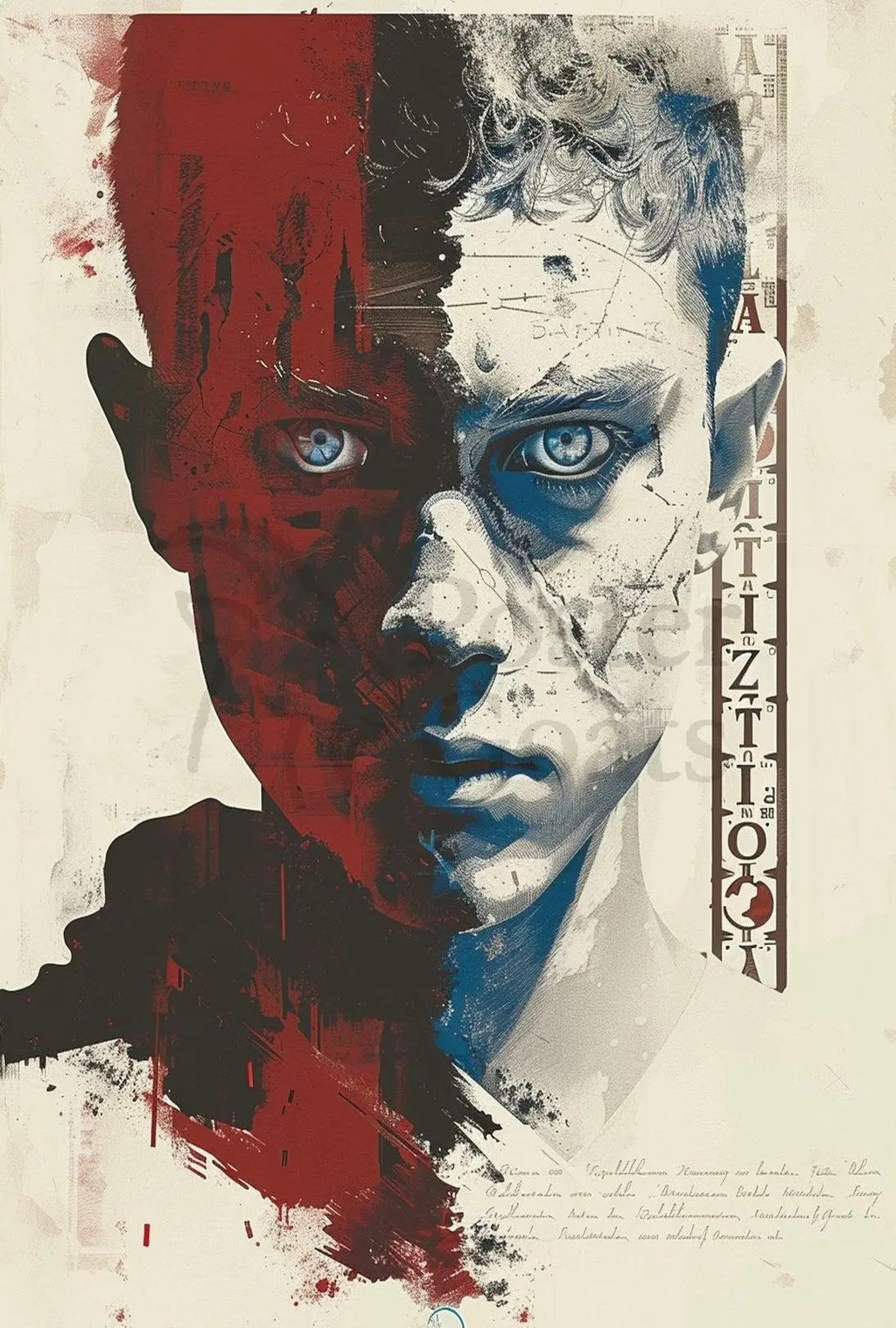 Elevate your walls with "Duality Unveiled" — an arresting, abstract artistic portrait poster from PosterGoat that explores identity, conflict, and transformation through bold graphic elements. This visually striking piece splits a photorealistic face into two contrasting halves — rich crimson and cool blue — layered with textured grunge marks, typographic accents and subtle illustrative details that reward close inspection.