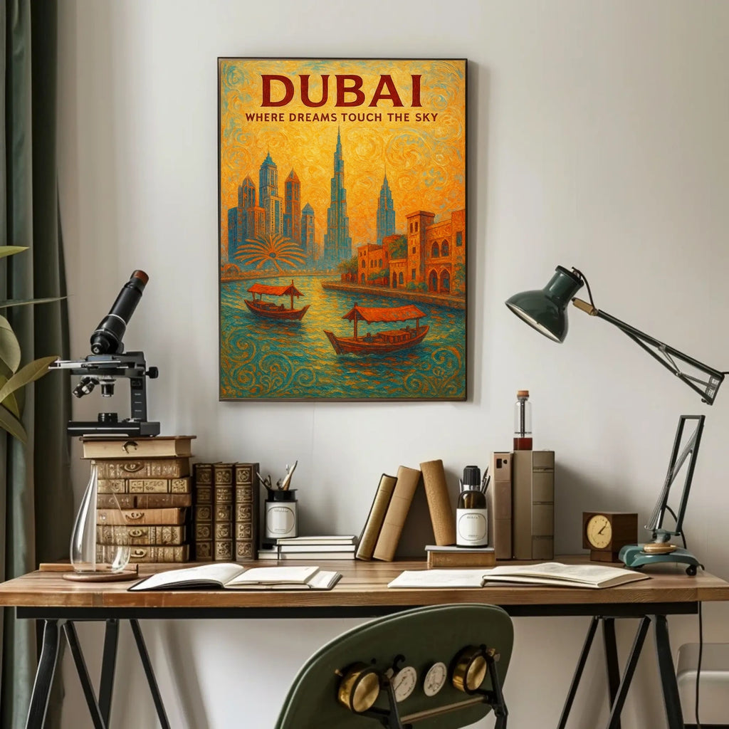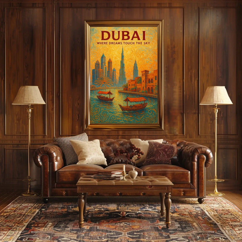 Bring home the Dubai Where Dreams Touch the Sky poster, a vivid tribute to Dubai's iconic architecture and serene waterways. The warm hues and expressive style spark awe, inviting you to imagine a future where innovation meets tradition in your own space.