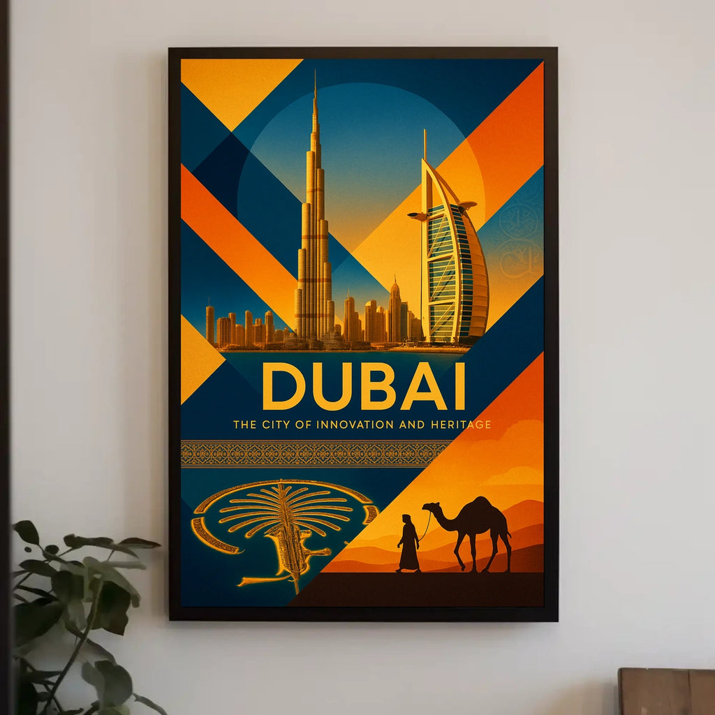 Discover a striking poster that captures Dubai as a city where cutting-edge modern architecture meets deep cultural heritage. This artwork blends iconic landmarks like the Burj Khalifa and Burj Al Arab with timeless desert imagery and a camel motif, inviting viewers to experience a city that evolves without losing its roots.