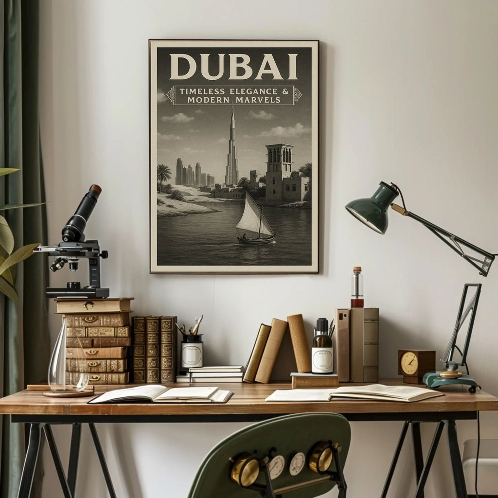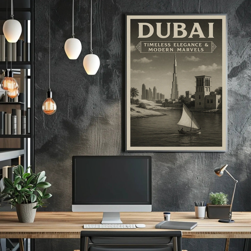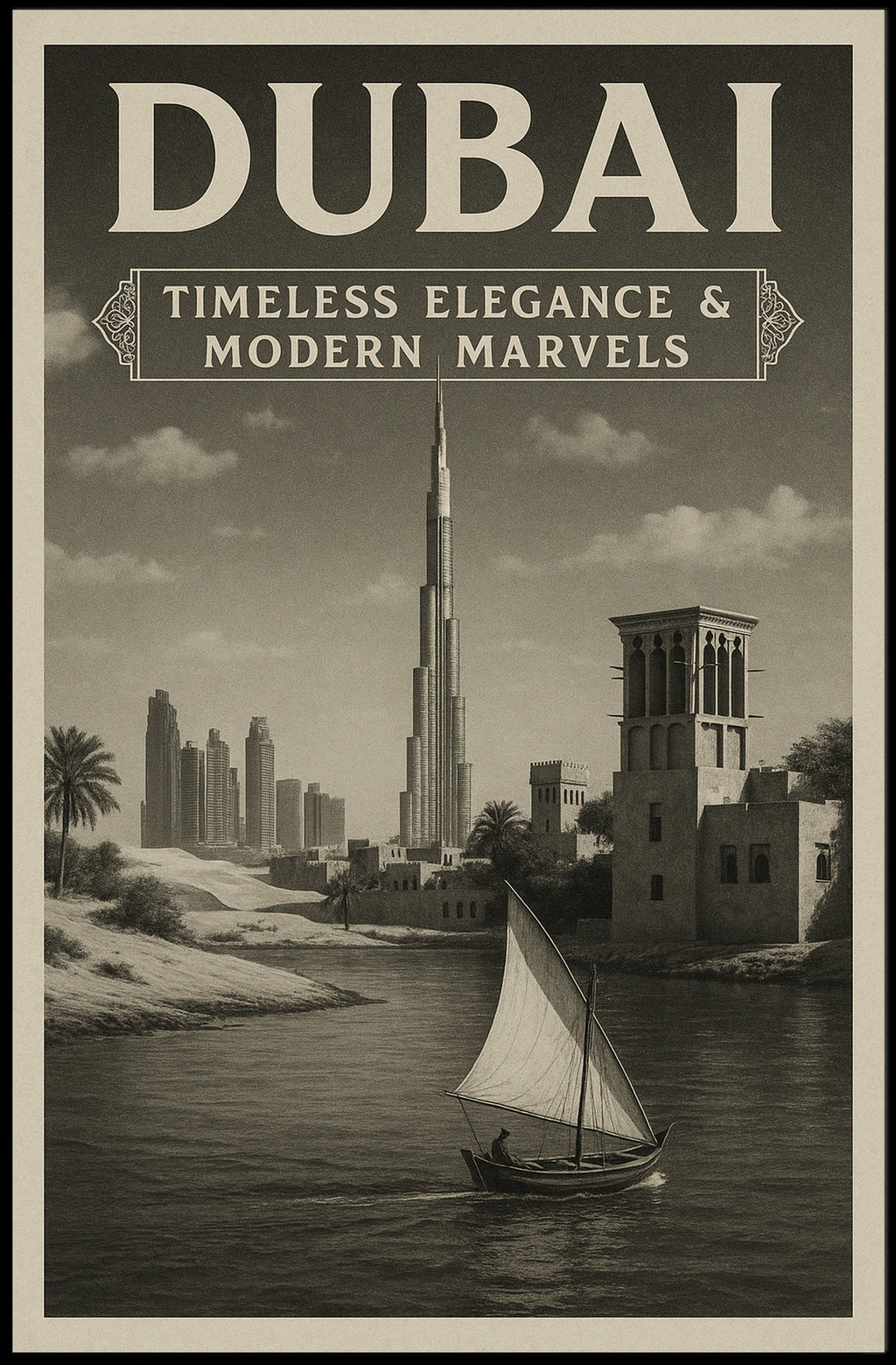Immerse your walls in the dynamic spirit of Dubai, where the past and future converge. This poster presents a captivating skyline narrative—skyscrapers rise beside traditional structures and tranquil waterways—reflecting a culture of ambition, hospitality, and innovative design that resonates in any living space or office. It’s a versatile expression of travel-inspired modernity that fits contemporary decor.