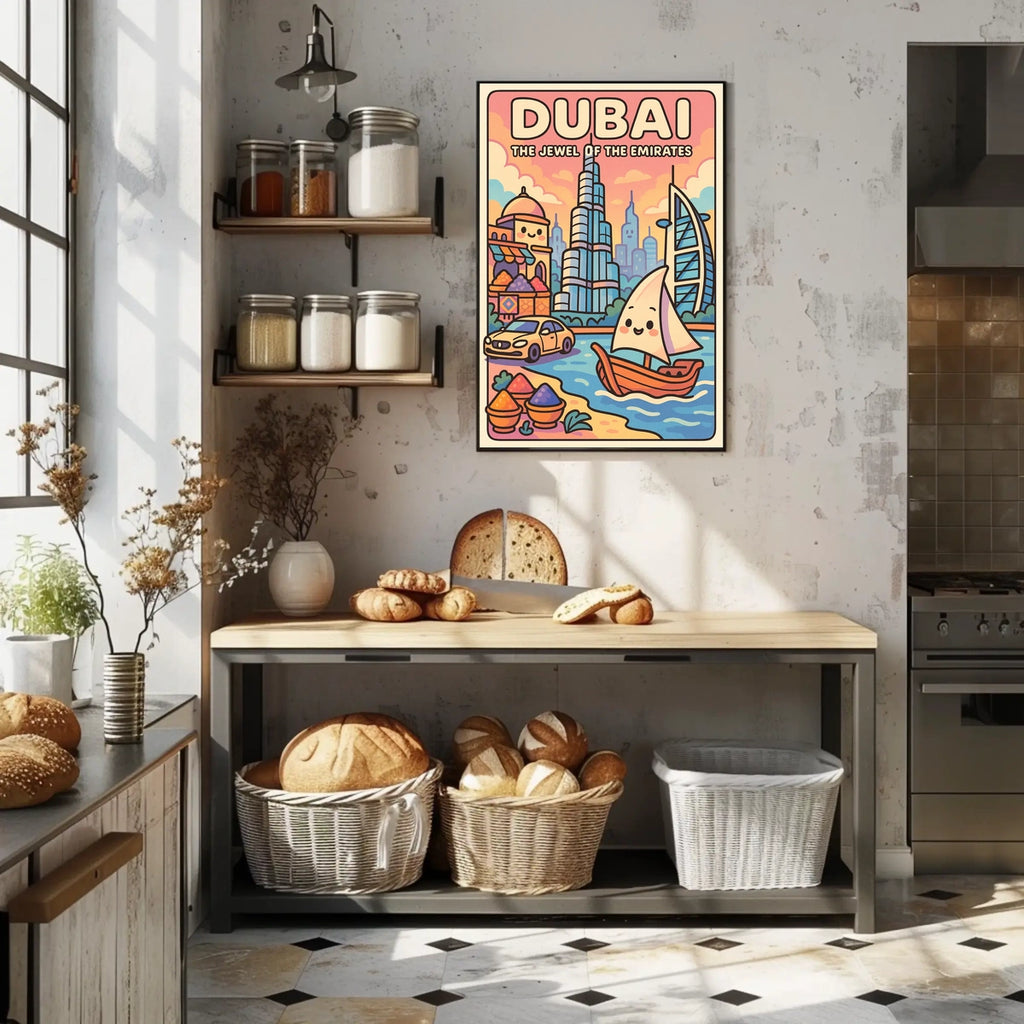 Intro: Discover Dubai's magnetic blend of tradition and modernity with this captivating poster. The illustration spotlights iconic landmarks like the Burj Khalifa and Burj Al Arab, while lively markets and a passing dhow celebrate the city’s dynamic spirit—perfect for travel lovers.
