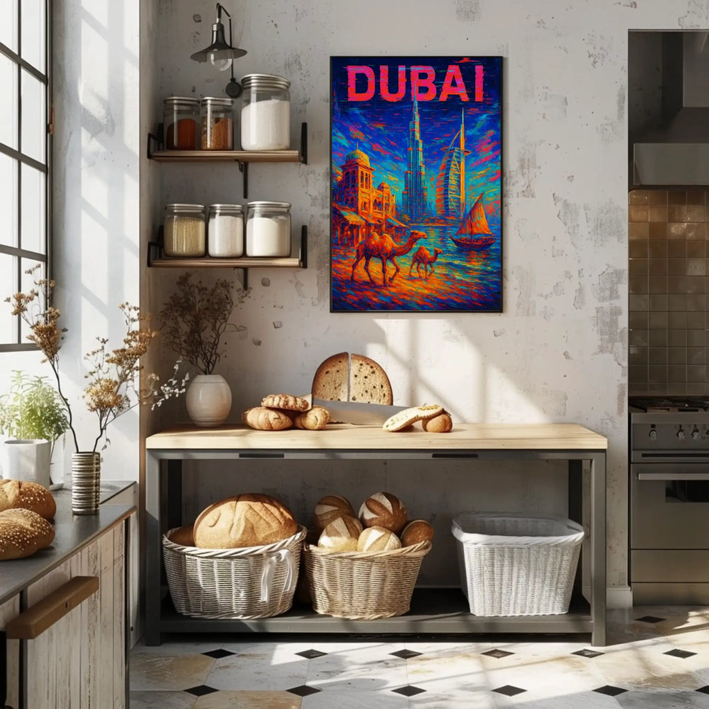 Experience the dynamic spirit of Dubai, a jewel of the Middle East, with this vibrant poster, where a futuristic skyline meets enduring cultural charm. It blends the iconic Burj Khalifa and Burj Al Arab with scenes of camels and dhows, delivering a bold centerpiece that resonates with travelers and design lovers alike. Perfect for living rooms, offices, or creative spaces that celebrate fusion and heritage.