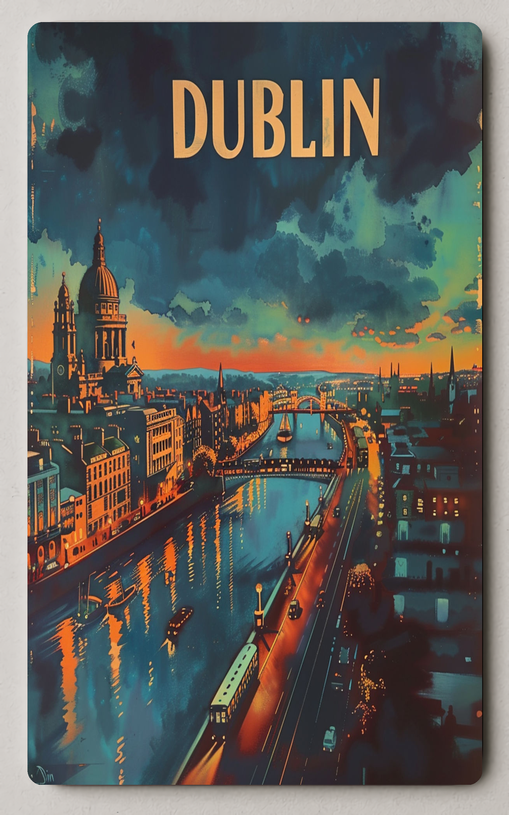Printed on premium card stock and finished with a satin sheen, this card highlights the rich, vibrant colors and fine architectural details visible in the illustration: domed landmarks, arched bridges, riverside buildings, and the glowing streets that define Dublin’s evening charm.