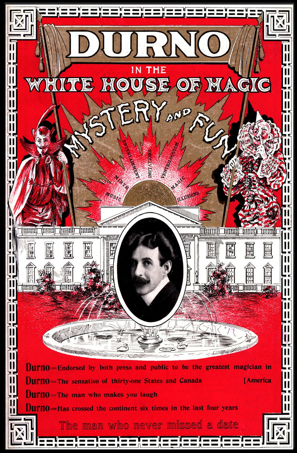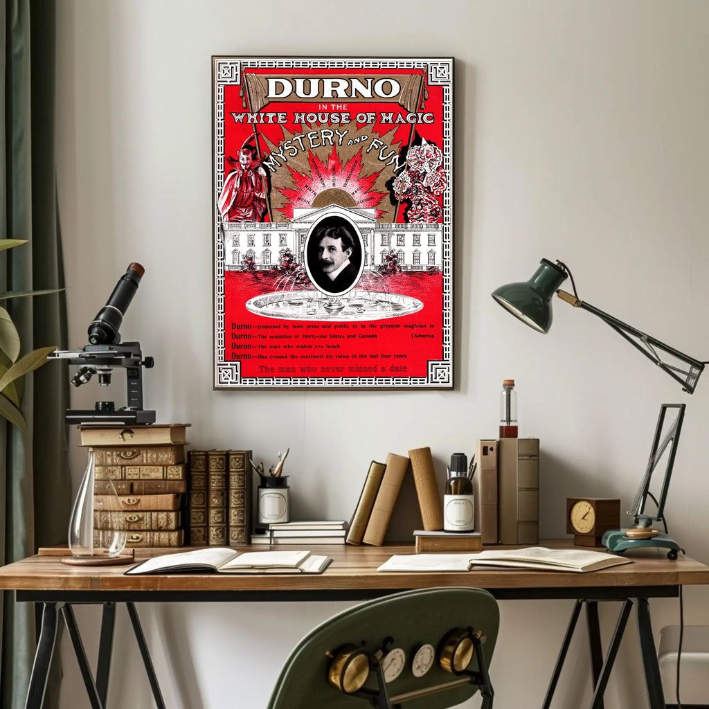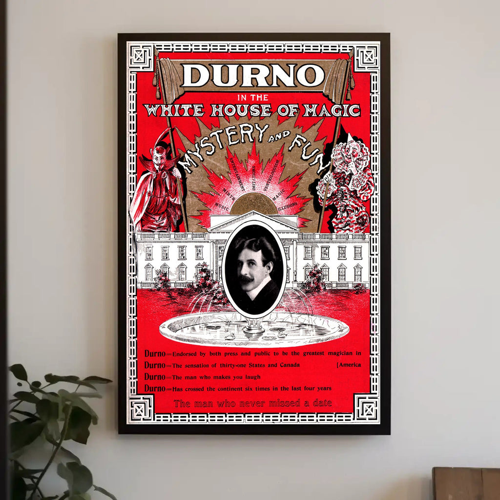 Durno the Magician Vintage Magic Show Cultural Poster from PosterGoat brings turn-of-the-century showmanship and bold retro design to your walls. This striking 18x24 poster features a vivid red background, ornate border work, and a central oval portrait framed by a dramatic fountain and an illustrated White House façade — a perfect focal point for collectors of classic magic art and vintage decor.