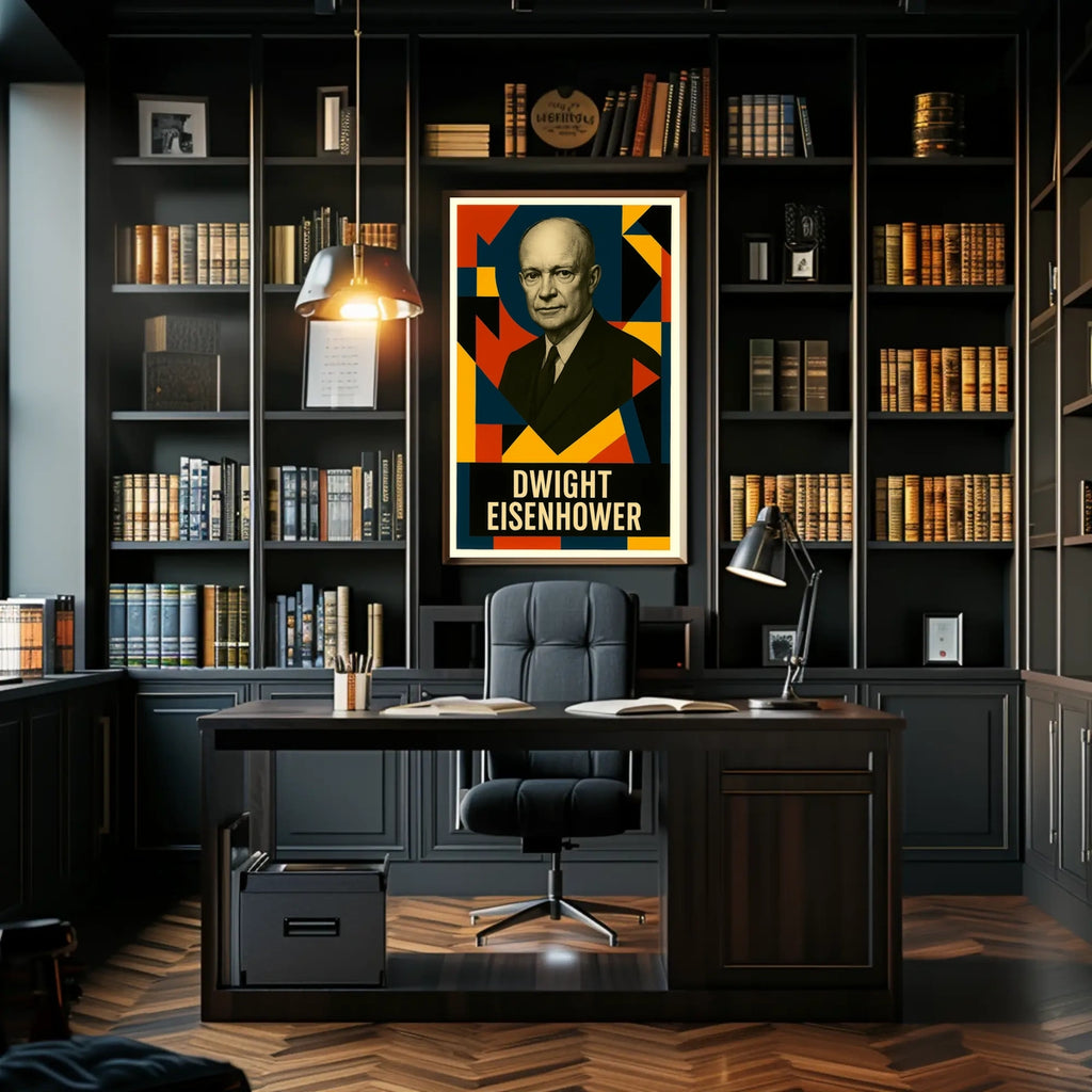 Poster of Dwight D. Eisenhower, the 34th president of the United States, in pop art. The print is for display on walls and can be grouped with posters. It belongs to posters and pairs with art. It uses elements to fit interiors. It supports framing and pairing with artwork. This piece appeals to collectors of politics and history. Value: adds context to a room. Packaging protects the print during transit. Product category is poster.
