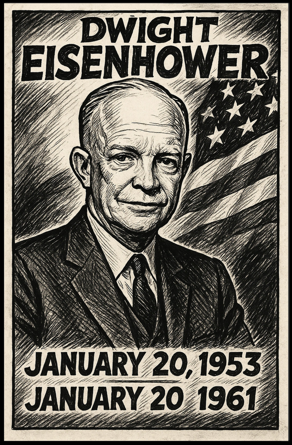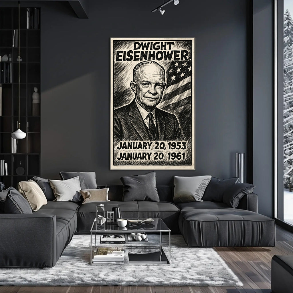 Capture a bold moment in American history with a black-and-white poster featuring Dwight D. Eisenhower, the 34th president of the United States. This comic-sketch-inspired artwork blends historical reverence with a contemporary graphic edge, making it ideal for history buffs, political enthusiasts, and art lovers alike.