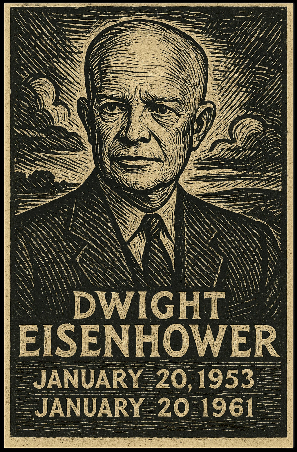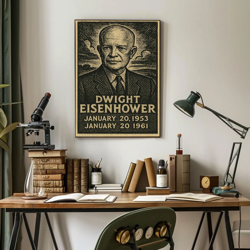 Celebrate Dwight Eisenhower's impactful presidency with this striking poster, capturing the essence of his leadership from 1953 to 1961. The artwork features a detailed portrait of Eisenhower, elegantly dressed in a suit and tie, rendered in a woodcut or linocut style that evokes a sense of historical nostalgia. This vintage-inspired piece is perfect for history enthusiasts and collectors, offering a formal and commemorative tribute to one of America's iconic leaders. Its textured appearance and classic design make it an ideal addition to any home or office decor, honoring Eisenhower's enduring legacy.