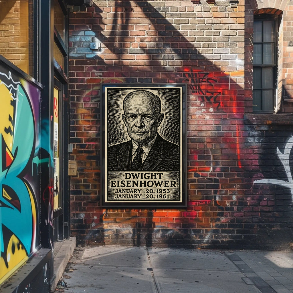 Ideal for living spaces, offices, classrooms, or galleries, this vintage-style poster serves as american history wall art and a patriotic decor piece. It honors the Eisenhower presidency and makes a timeless statement about leadership, resilience, and American history—a conversation starter for any room.