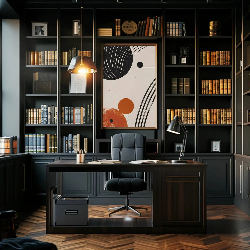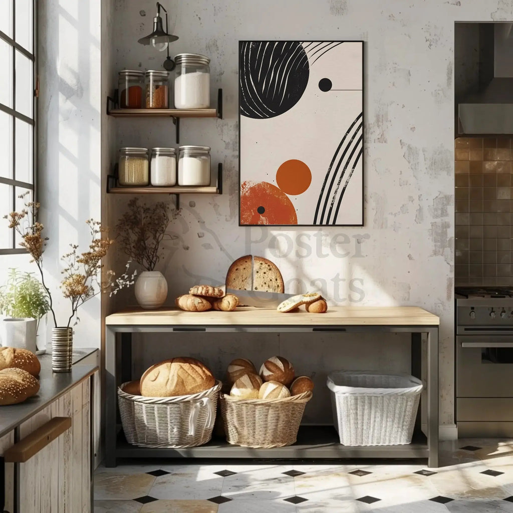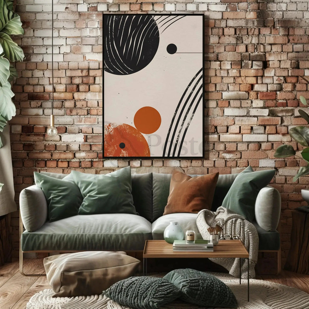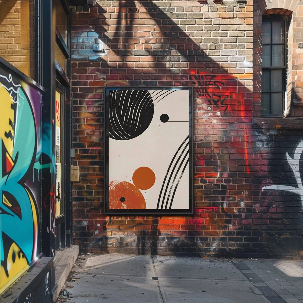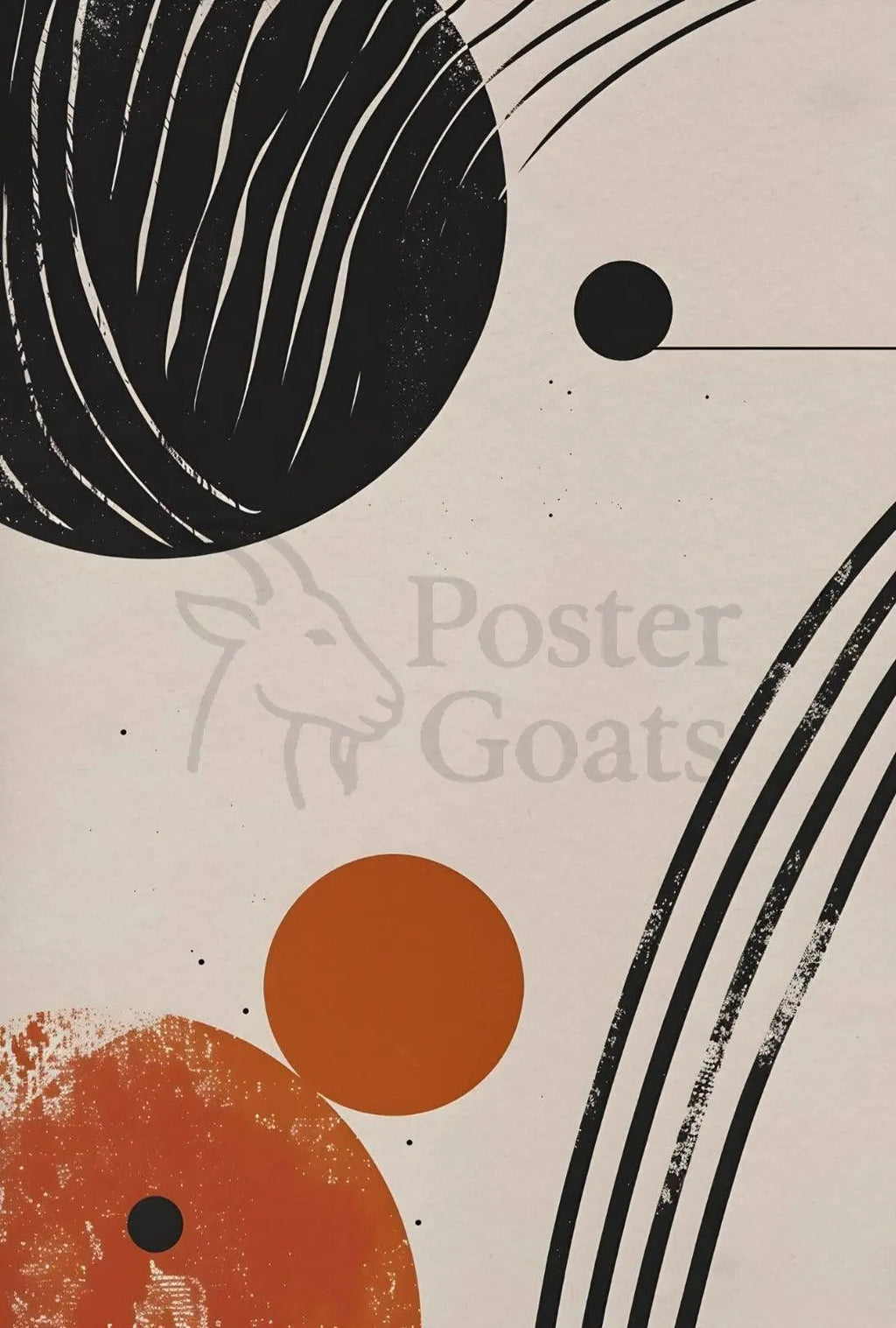 Dive into a world of artistic expression with this captivating abstract poster. Embracing a minimalist aesthetic, the design features dynamic circles and curved lines that suggest movement and connectivity. The contrasting tones of black, white, and orange create a warm, striking visual experience. Inspired by mid-century design, the textured layers add retro appeal, evoking a sense of cosmic wonder and futuristic allure. Perfect for modern art enthusiasts, its contemporary style is sure to elevate any space, imbuing it with a sense of balance and motion. Enhance your décor with this statement piece today.