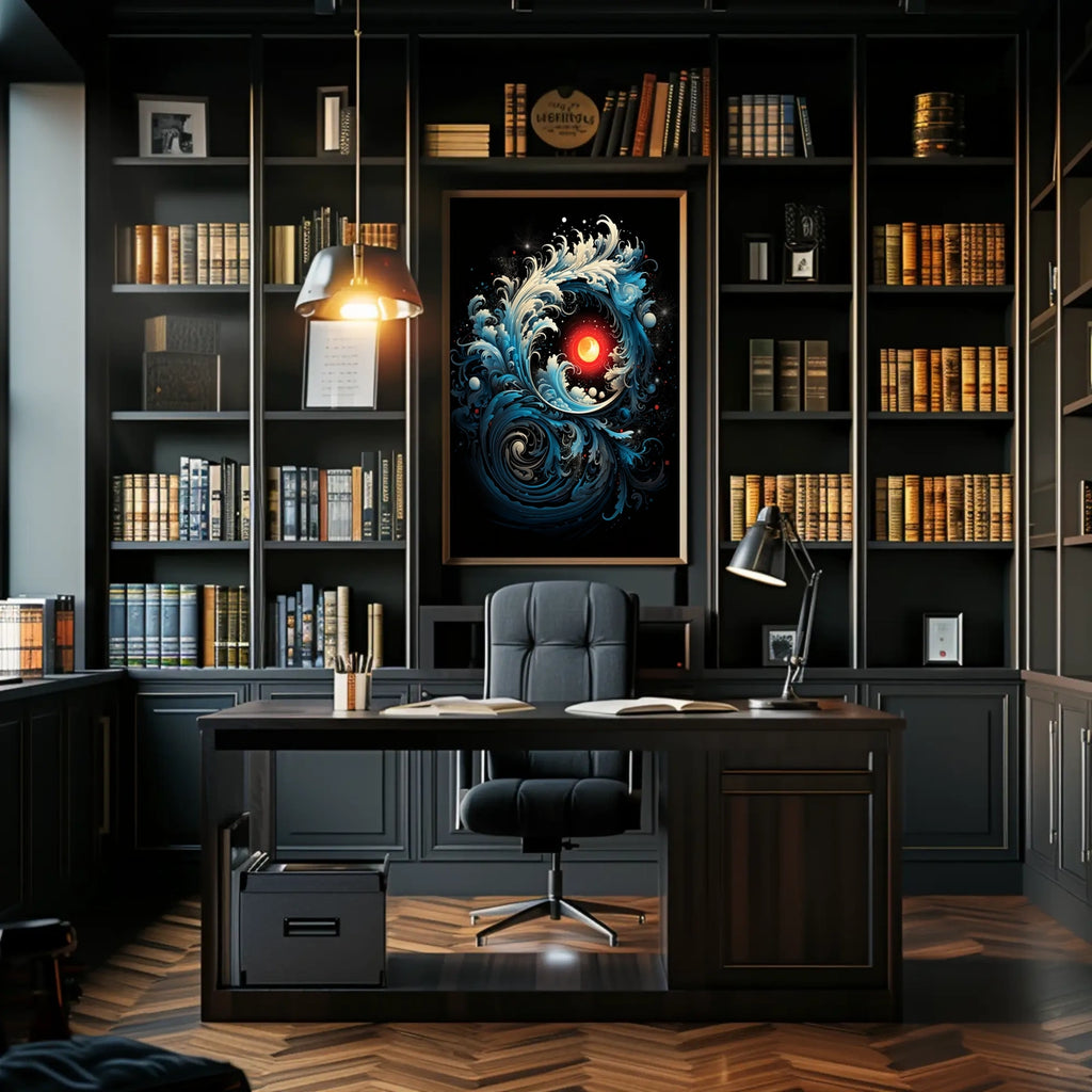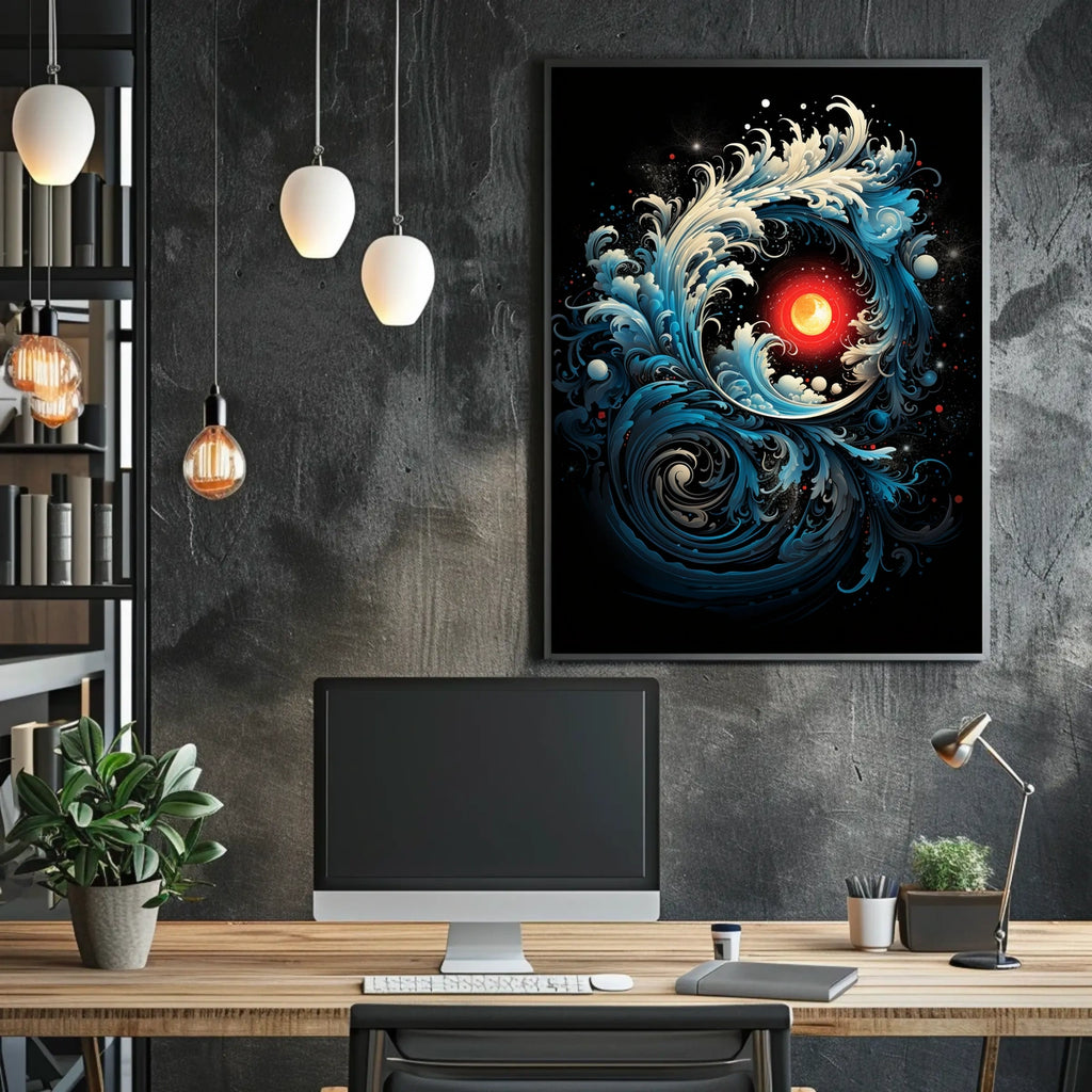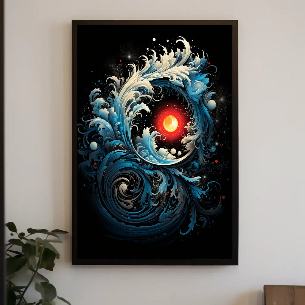 Celebrate the beauty of Dynamic Ocean Waves and Sun Abstract or Artistic Poster with this timeless wall art. This captivating poster showcases a striking illustration of swirling ocean waves enveloping a glowing sun, rendered with rich, bold colors. Deep blues, creams, and vibrant reds contrast dramatically against a dark backdrop, creating a vivid visual impact. The stylized waves, with intricate patterns and fluid motion, echo the dynamic energy of Japanese art, particularly reminiscent of Hokusai's masterpieces. Enhanced by detailed textures and cosmic elements like star-like specks, this poster exudes a modern surrealistic appeal. Ideal for art enthusiasts, it resonates with themes of nature’s power and cosmic harmony.