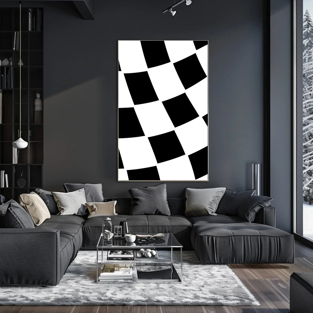 This striking poster captures the essence of motion and excitement with its bold, black and white checkerboard pattern, reminiscent of a racing flag. The dynamic, wavy arrangement of squares creates a sense of speed and energy, perfectly suited for sports enthusiasts and competitive spirits. The geometric design embraces modern artistic styles, using high contrast to draw the eye and invigorate any space. Its simple yet engaging aesthetic makes it an ideal choice for decorating game rooms, sports bars, or even contemporary offices. Celebrate themes of competition and modernity with this captivating artwork.