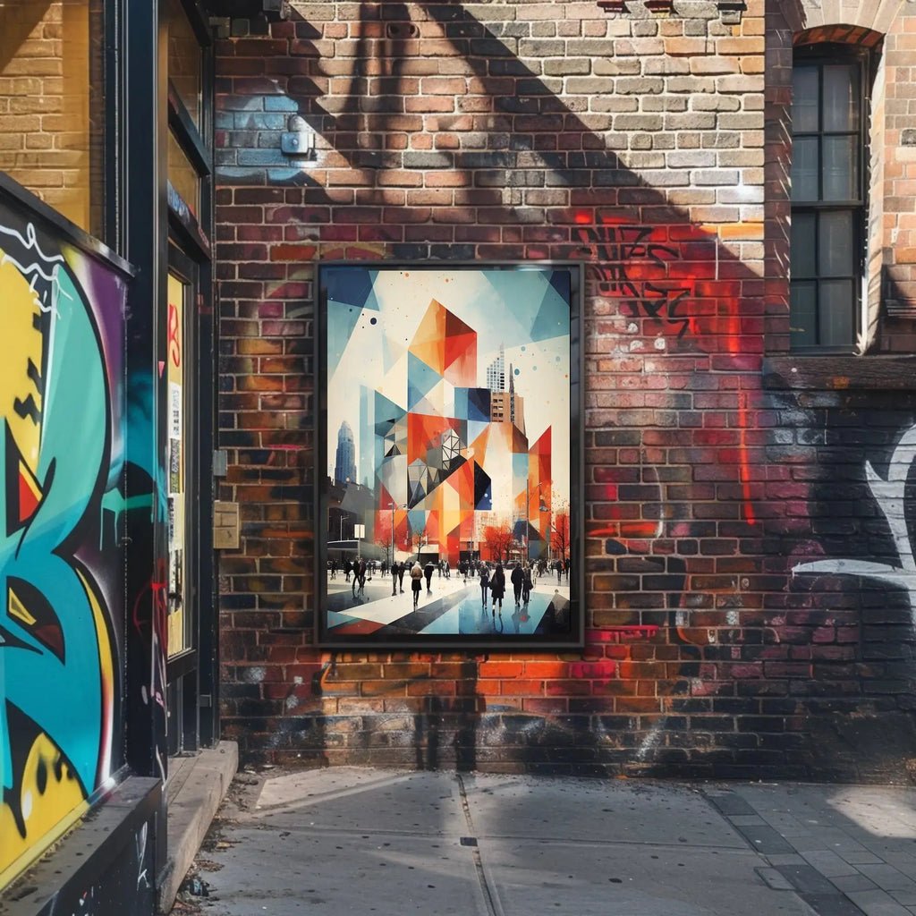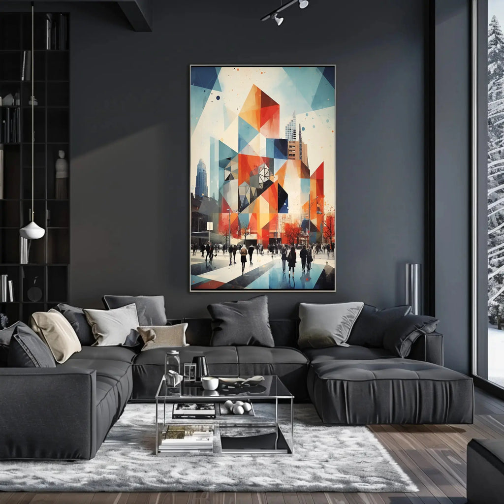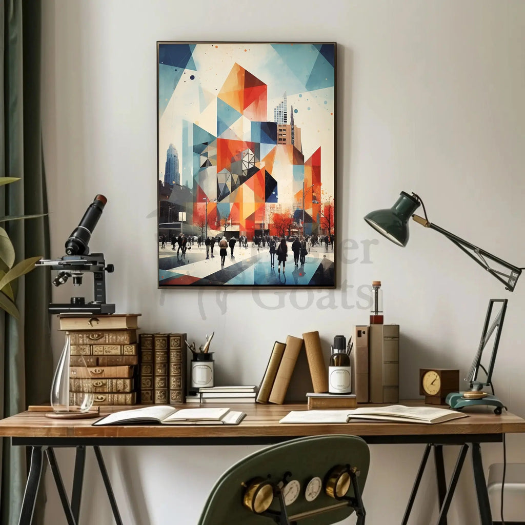 Dynamic Urban Scene: Abstract Art Poster from PosterGoat brings the pulse of the city into your home or office with a bold, geometric reinterpretation of an urban skyline. Rich layers of triangular shapes and translucent panels build a towering composition of warm oranges, cool blues and soft neutrals that catch the eye from across the room.