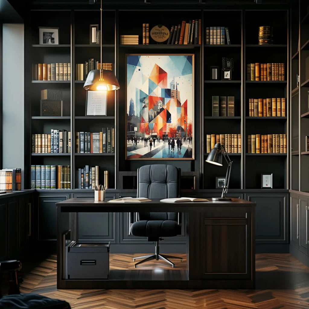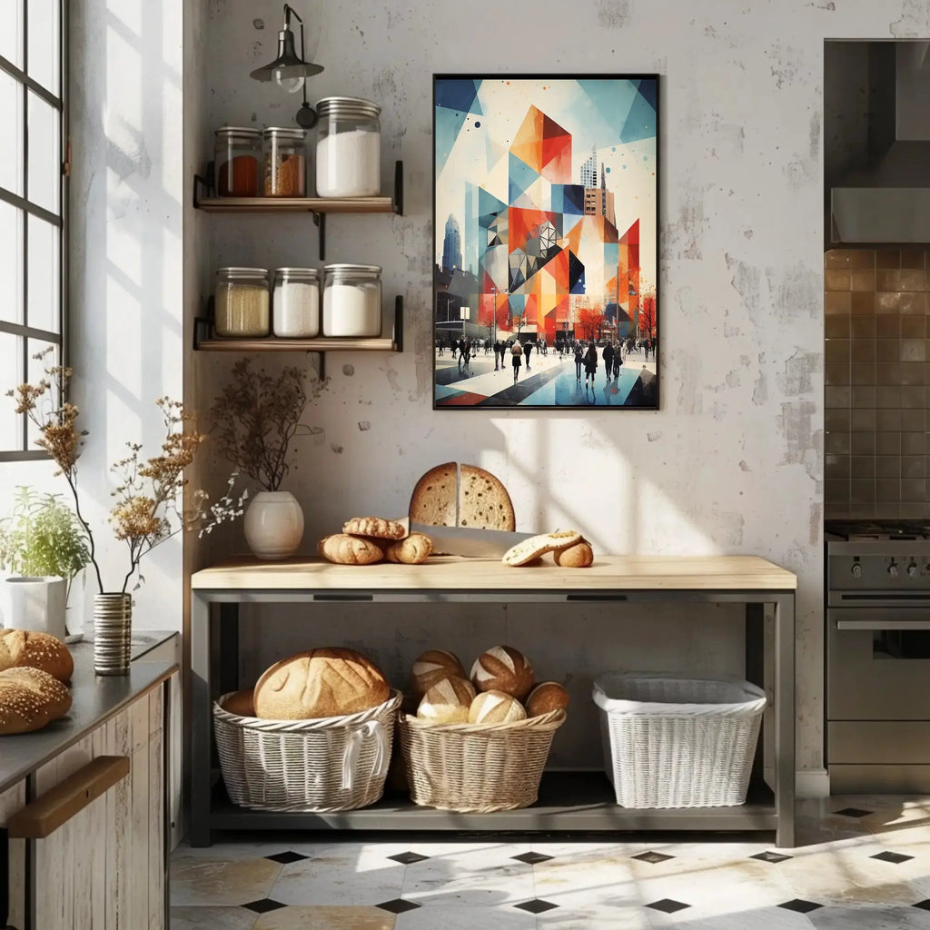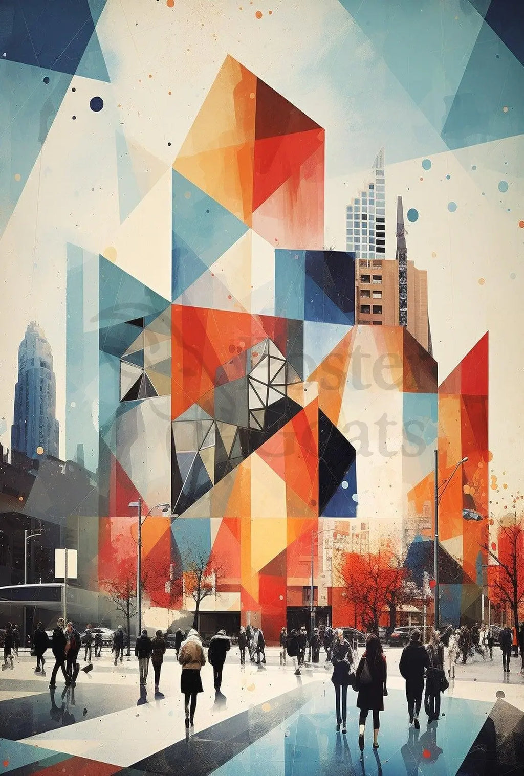 Dynamic Urban Scene: Abstract Art Poster from PosterGoat brings the pulse of the city into your home or office with a bold, geometric reinterpretation of an urban skyline. Rich layers of triangular shapes and translucent panels build a towering composition of warm oranges, cool blues and soft neutrals that catch the eye from across the room.