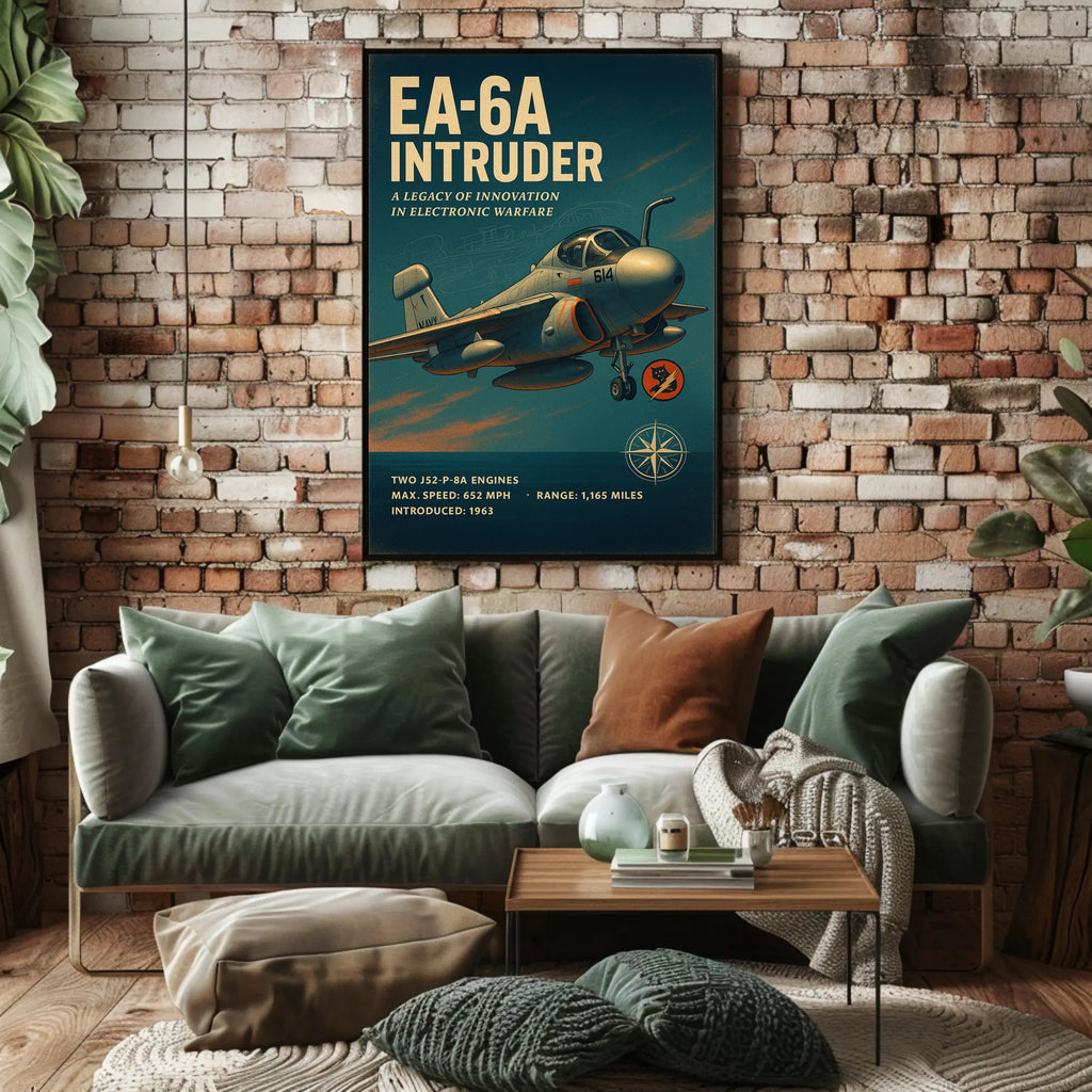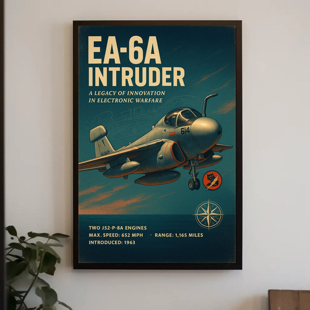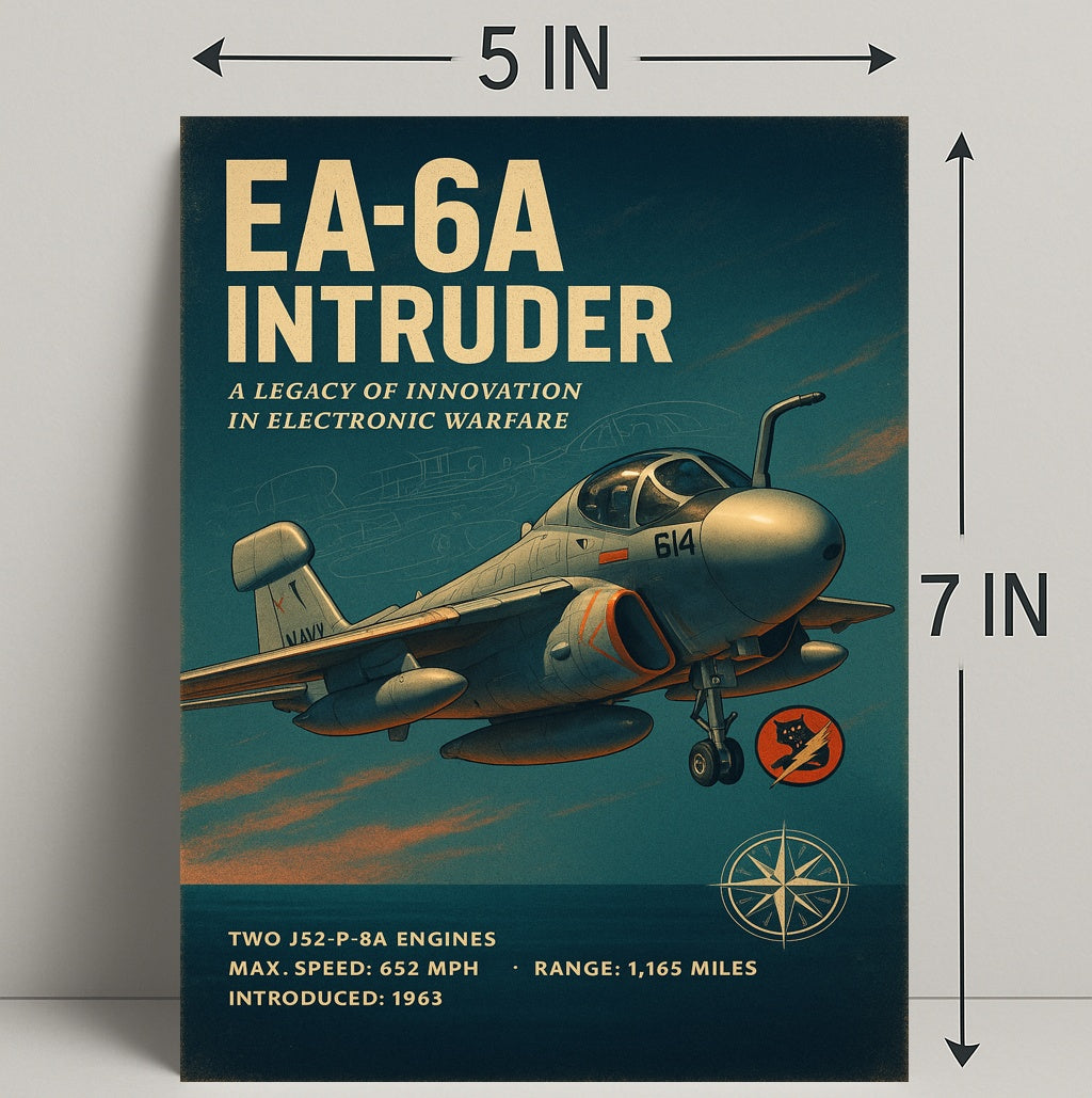Iconic Design: Features a vintage-inspired illustration of the EA-6A Intruder, celebrated for its role in electronic warfare.
