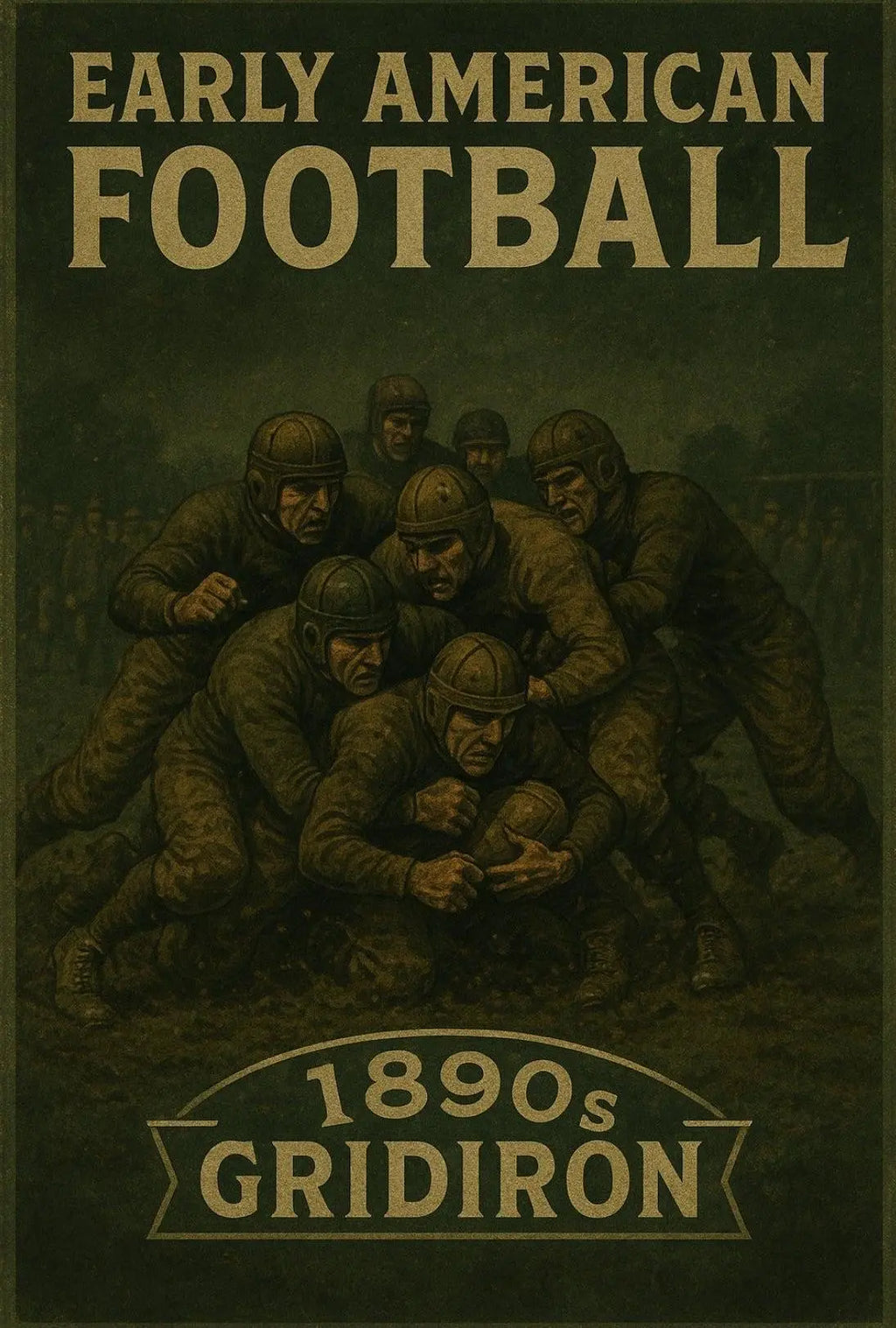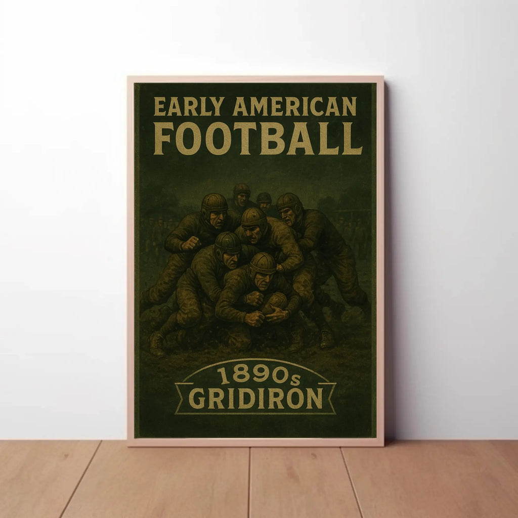 Experience a journey back to the rugged beginnings of American football with our nostalgic poster. This stunning vintage piece captures the spirit of the 1890s gridiron, showcasing players outfitted in traditional leather helmets and old-fashioned gear. With its muted earthy tones and illustrative design, the poster conveys a sense of history and teamwork, emphasizing the intense nature of the sport's early days. Perfect for sports enthusiasts and vintage art lovers alike, this poster is not just a depiction but a celebration of early American sports culture.