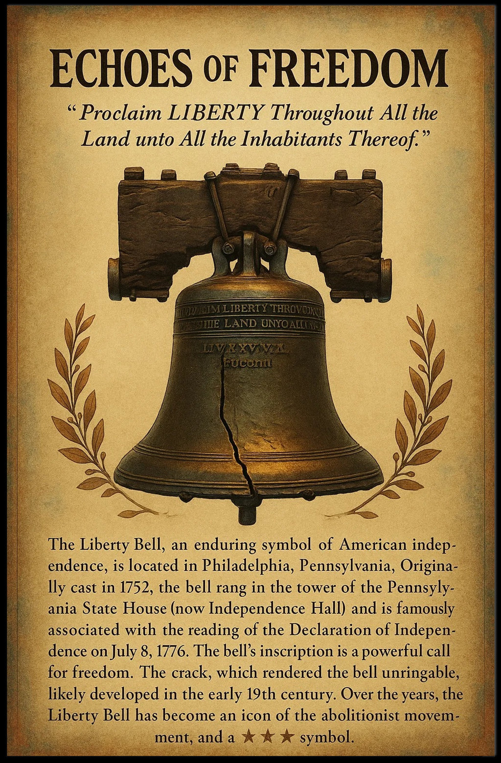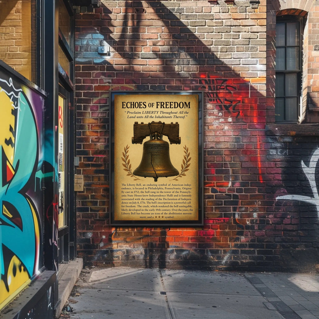 This 18x24 poster (SKU: SFAE-A-185, Batch: SFAE-A) blends scenic inspiration with a refined, minimalist layout to create a conversation-starting piece ideal for home, office, or travel-themed spaces. The aged paper texture, classic serif headline “ECHOES OF FREEDOM,” and the bell’s worn bronze detail deliver authentic vintage appeal while maintaining modern simplicity.