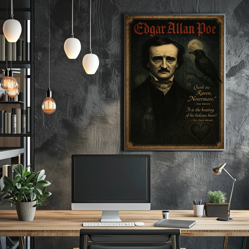 Elevate your walls with the Edgar Allan Poe Literary Icon Poster from PosterGoat — a richly detailed, vintage-inspired art print that celebrates one of classic literature’s darkest voices. This poster blends a haunting portrait of Poe, a perched raven beneath a full moon, and elegant gothic typography to create a striking focal point for any home decor, reading nook, or study.