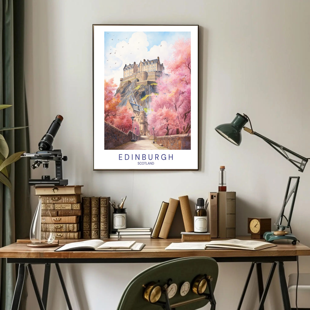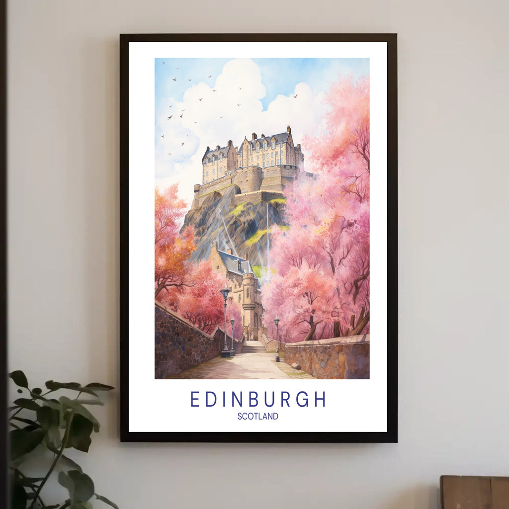 Experience the captivating beauty of Edinburgh, Scotland, with this enchanting poster capturing the iconic Edinburgh Castle surrounded by vibrant pink cherry blossoms. This modern illustrative piece showcases the castle perched majestically on a rocky hill, serving as a symbol of the city's rich heritage. Soft pastel hues and delicate details bring a whimsical yet realistic touch, immersing viewers in a scene filled with serenity and charm. This stunning artwork is perfect for those with a love for travel and cultural exploration, evoking a sense of romance and wanderlust.
