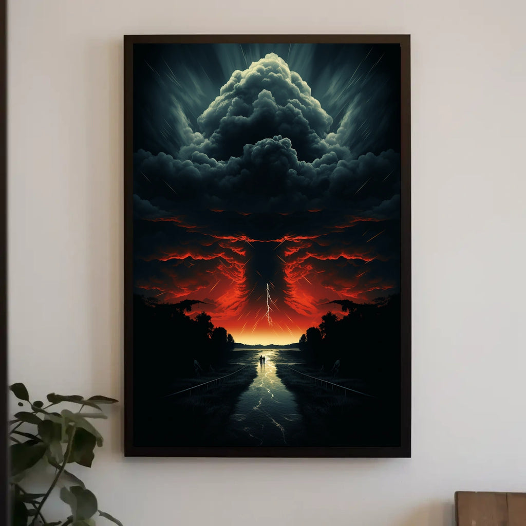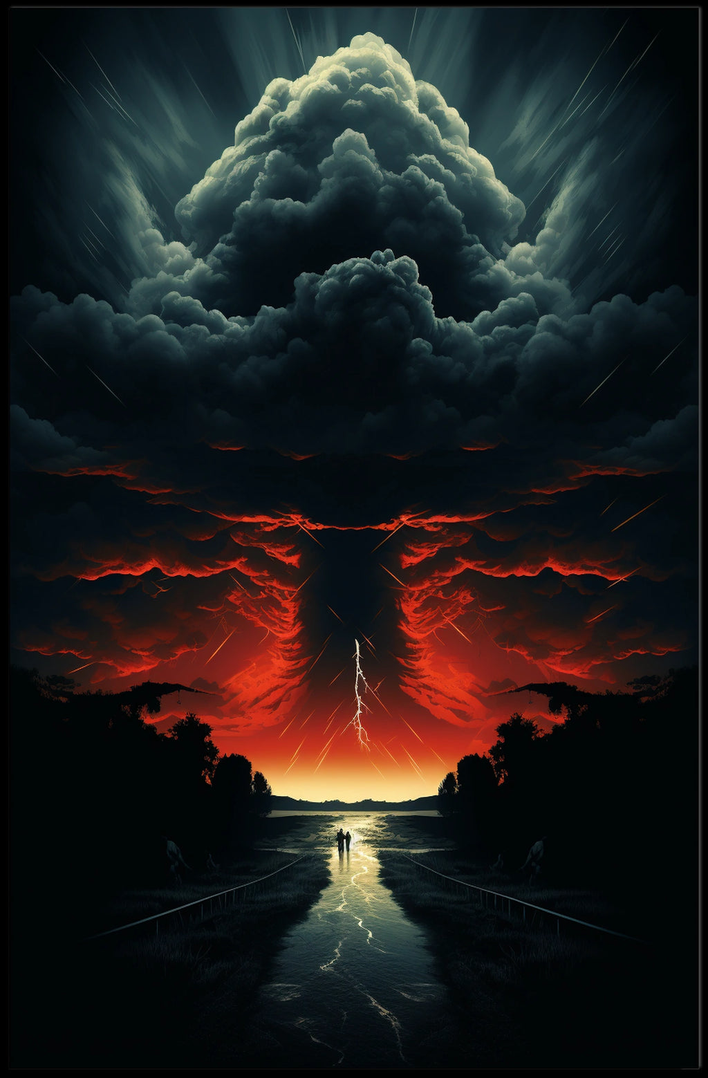 Step into an evocative realm where realism meets imagination. A couple walks along a reflective wet road that appears to stretch toward a horizon ablaze with an intense red and orange sky. Above, dark clouds and a bright lightning bolt split the sky, hinting at an approaching storm. Silhouetted trees frame the scene, lending mystery and timelessness to the moment.