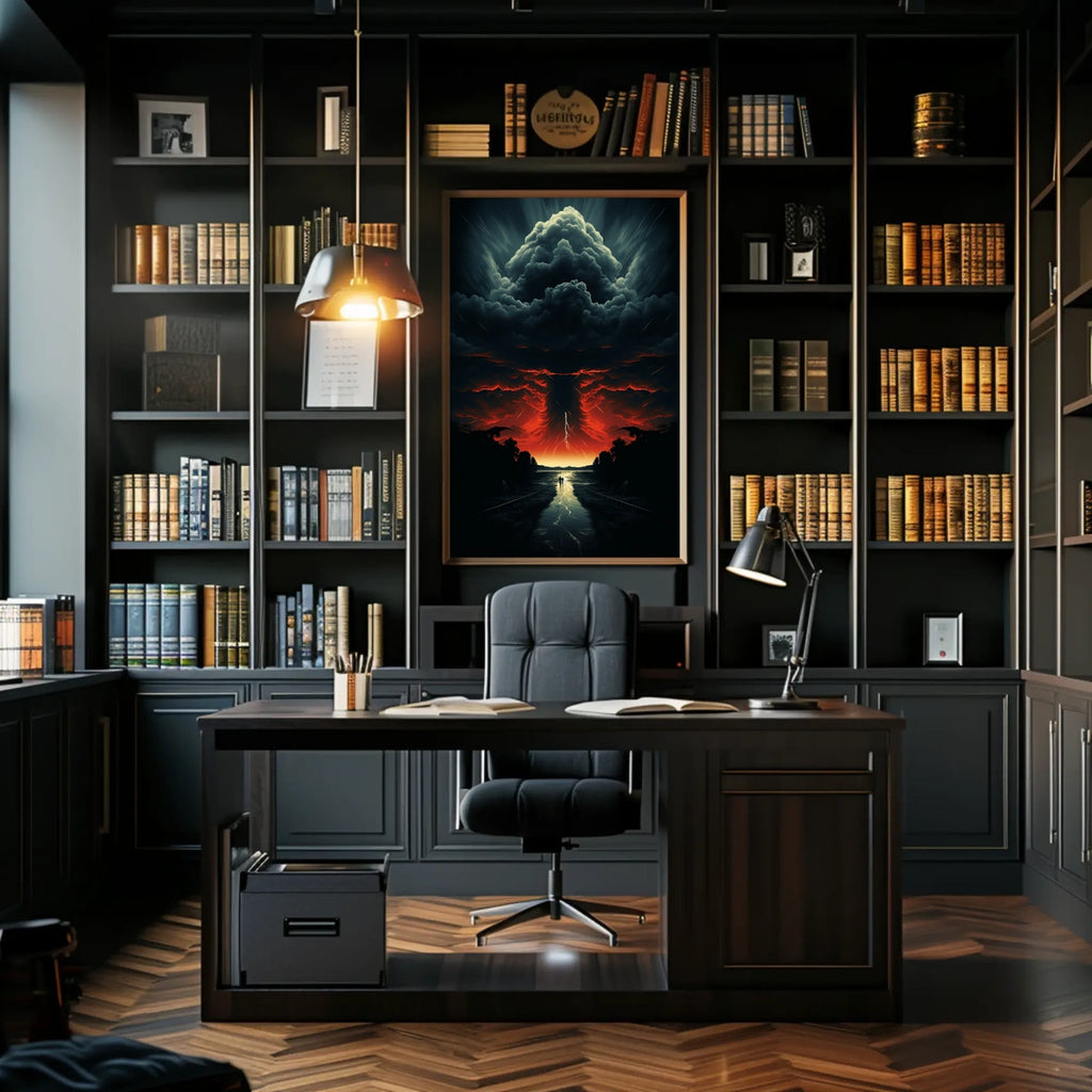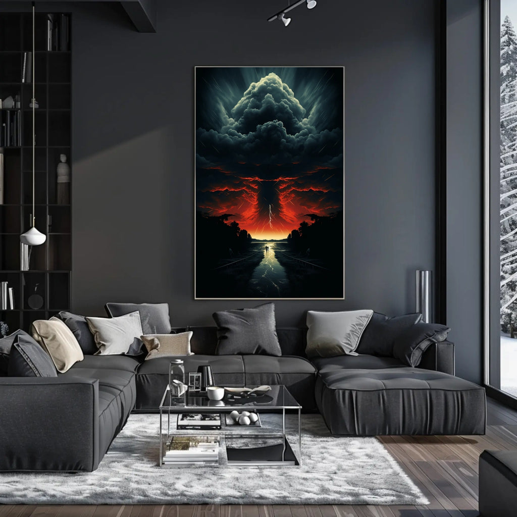 This dramatic visual narrative resonates with those drawn to nature's power and the enigmatic beauty of dusk-lit landscapes. It will captivate viewers with its awe-inspiring atmosphere and thought-provoking mood.