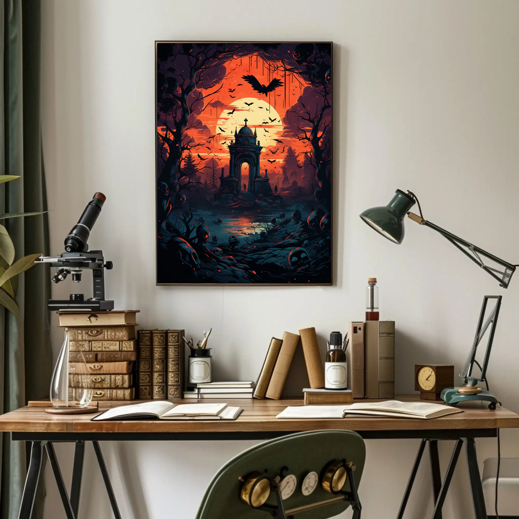 Invite a hauntingly beautiful atmosphere into your home with the Eerie Twilight Poster by PosterGoat — a striking piece of wall art that blends minimalist composition with rich, cinematic color. This artwork captures a twilight scene where a towering mausoleum silhouette stands before a blood-orange moon, flanked by gnarled trees, flitting bats, and subtle pools of reflected light that draw the eye into a mysterious, otherworldly landscape.