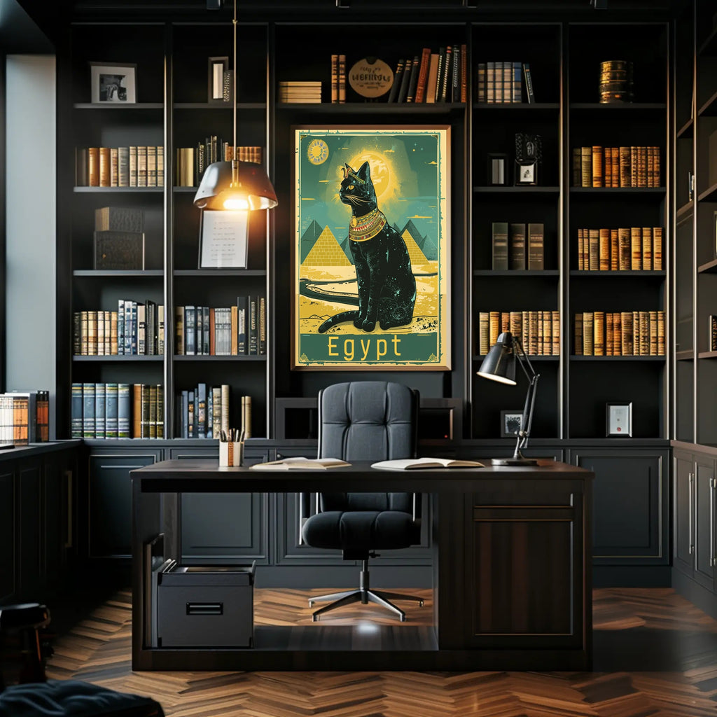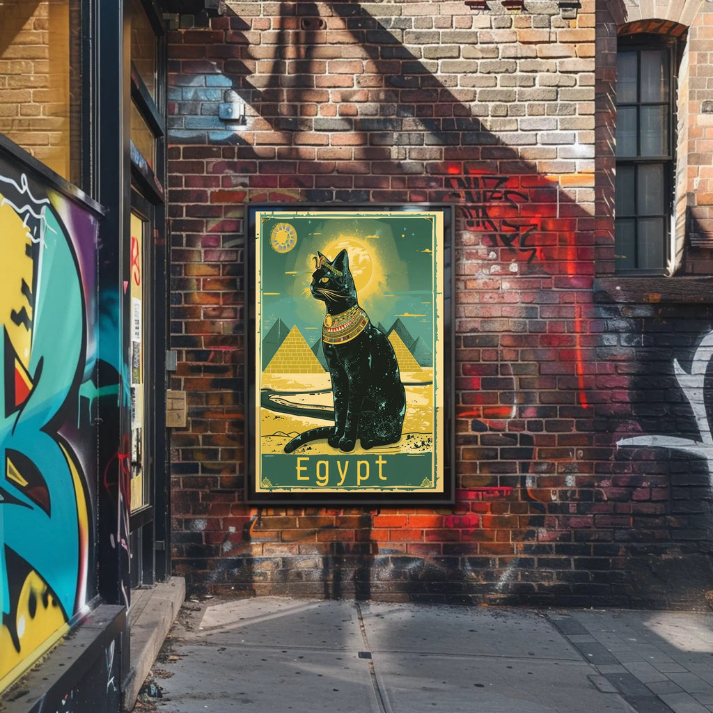 Elevate your space with a striking fusion of myth and modern design: this Egyptian Cat and Pyramids poster from PosterGoat captures the timeless mystique of ancient Egypt in a bold, retro-modern illustration. A regal black cat sits poised in front of iconic pyramids, wearing an ornate golden collar and traditional headdress, all set against a glowing sun and a teal-and-gold color palette that blends vintage travel-poster charm with vaporwave flair.