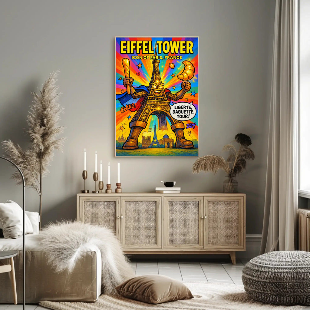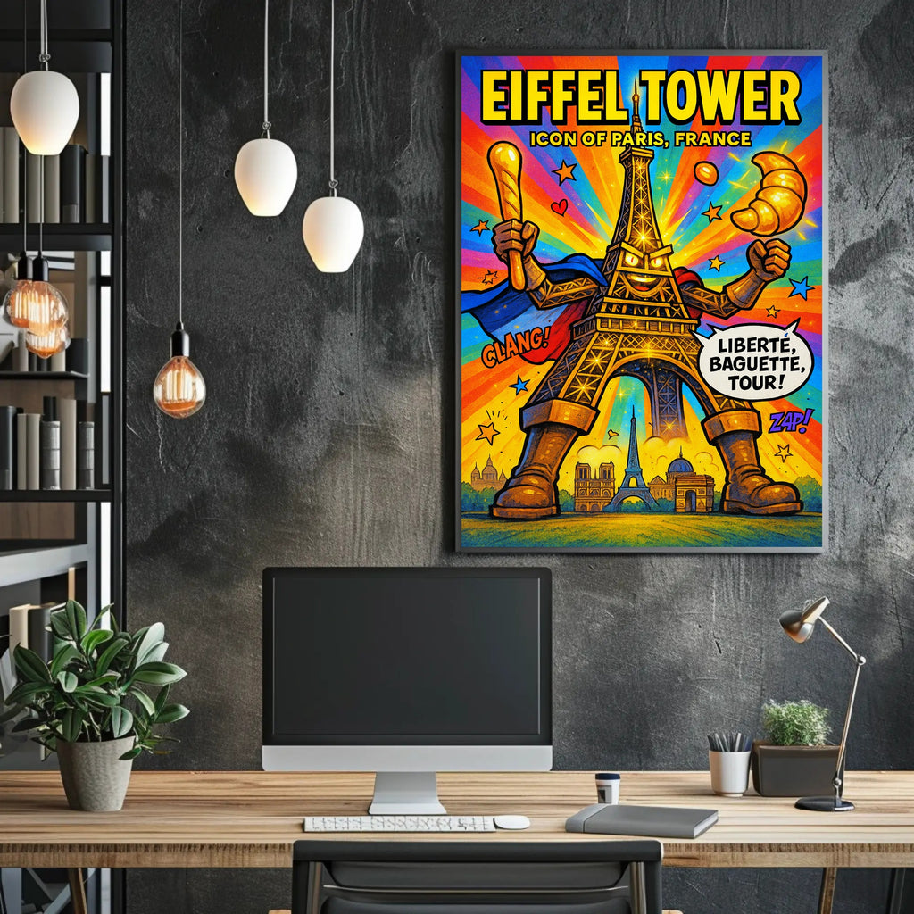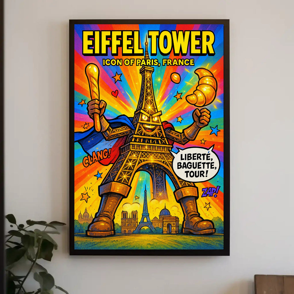 Bring Parisian energy into any room with the "Eiffel Tower Iconic Paris Persona Poster" from PosterGoat — a vibrant, comic‑style artwork that transforms the classic Eiffel Tower into a heroic, playful icon. Perfect for home decor enthusiasts and travel lovers, this print adds bold color and whimsical charm to living rooms, bedrooms, offices, and gallery walls.