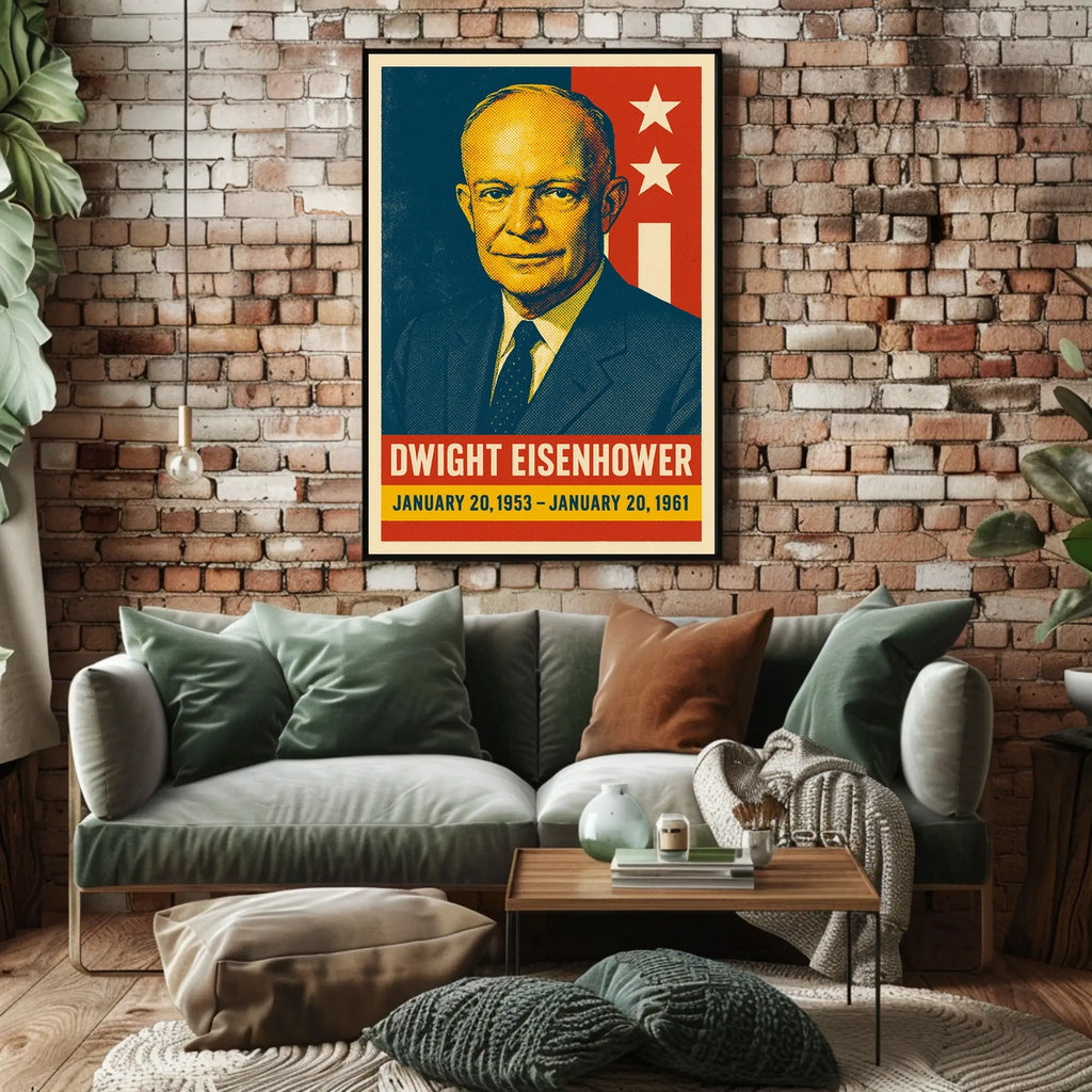 Celebrate the legacy of Dwight Eisenhower with the Eisenhower Retro Patriotic Portrait Poster Art Print — a striking poster that captures his influential years as President of the United States from 1953 to 1961. This artwork features a stylized portrait rendered in a vintage artistic style, using bold primary colors of red, blue, and yellow to create a retro, patriotic theme. The backdrop is adorned with white stars on a red field, enhancing the nostalgic, authoritative mood. Perfect for history enthusiasts or political aficionados, this poster is an ideal addition to any space seeking American pride and historical significance.